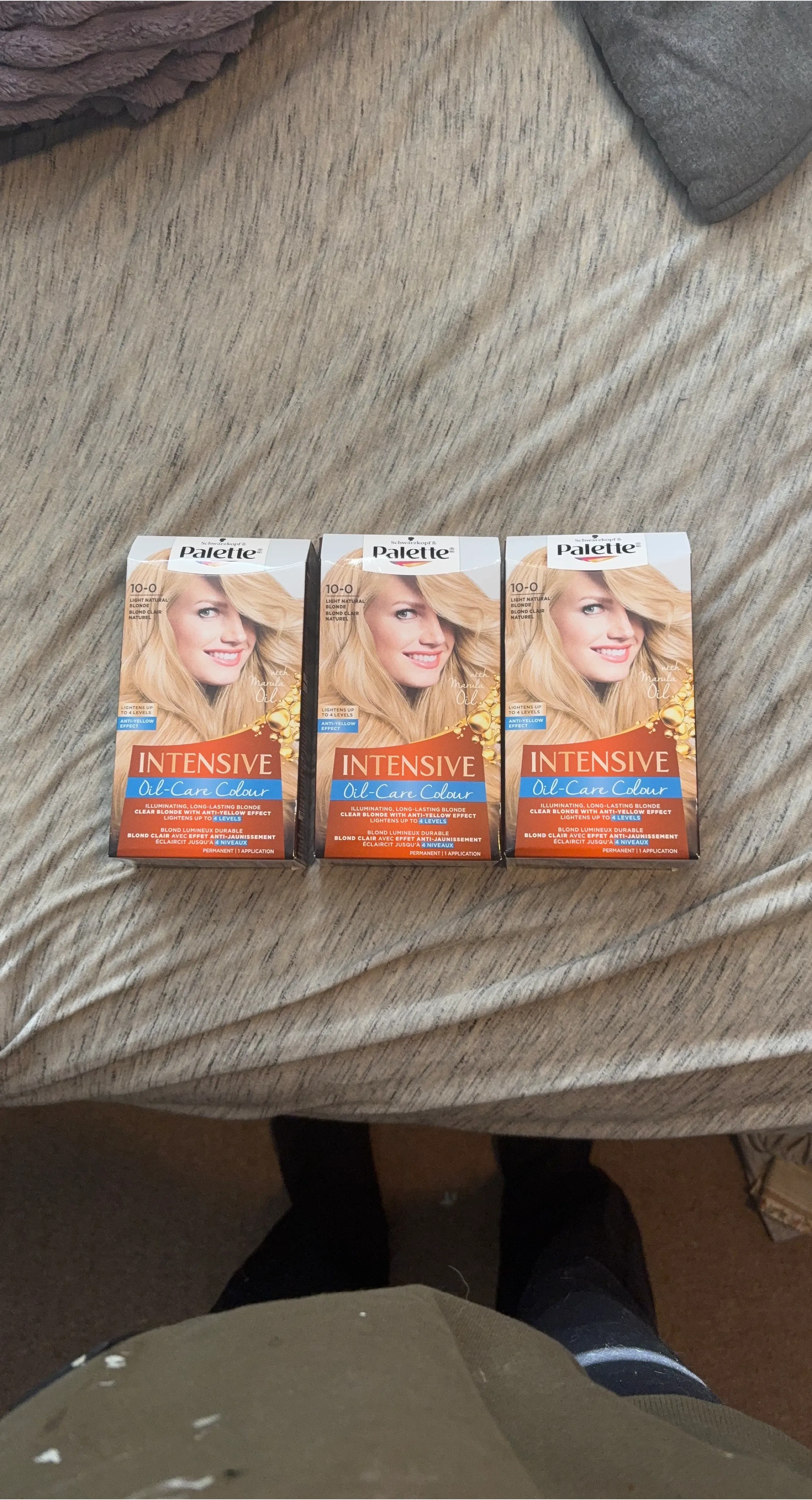 Palette Intensive Oil-Care Colour in shade 10-0 Light Natural Blonde. It's a permanent hair colour with an anti-yellow effect and Marula Oil. This formula lightens up to 4 levels.
