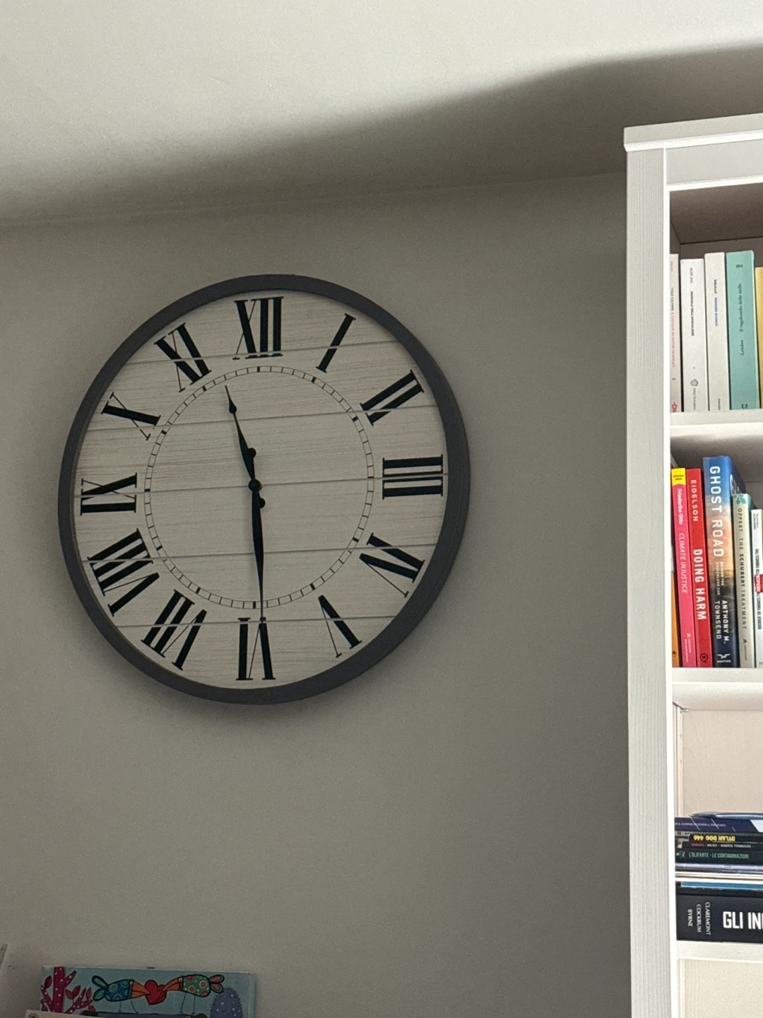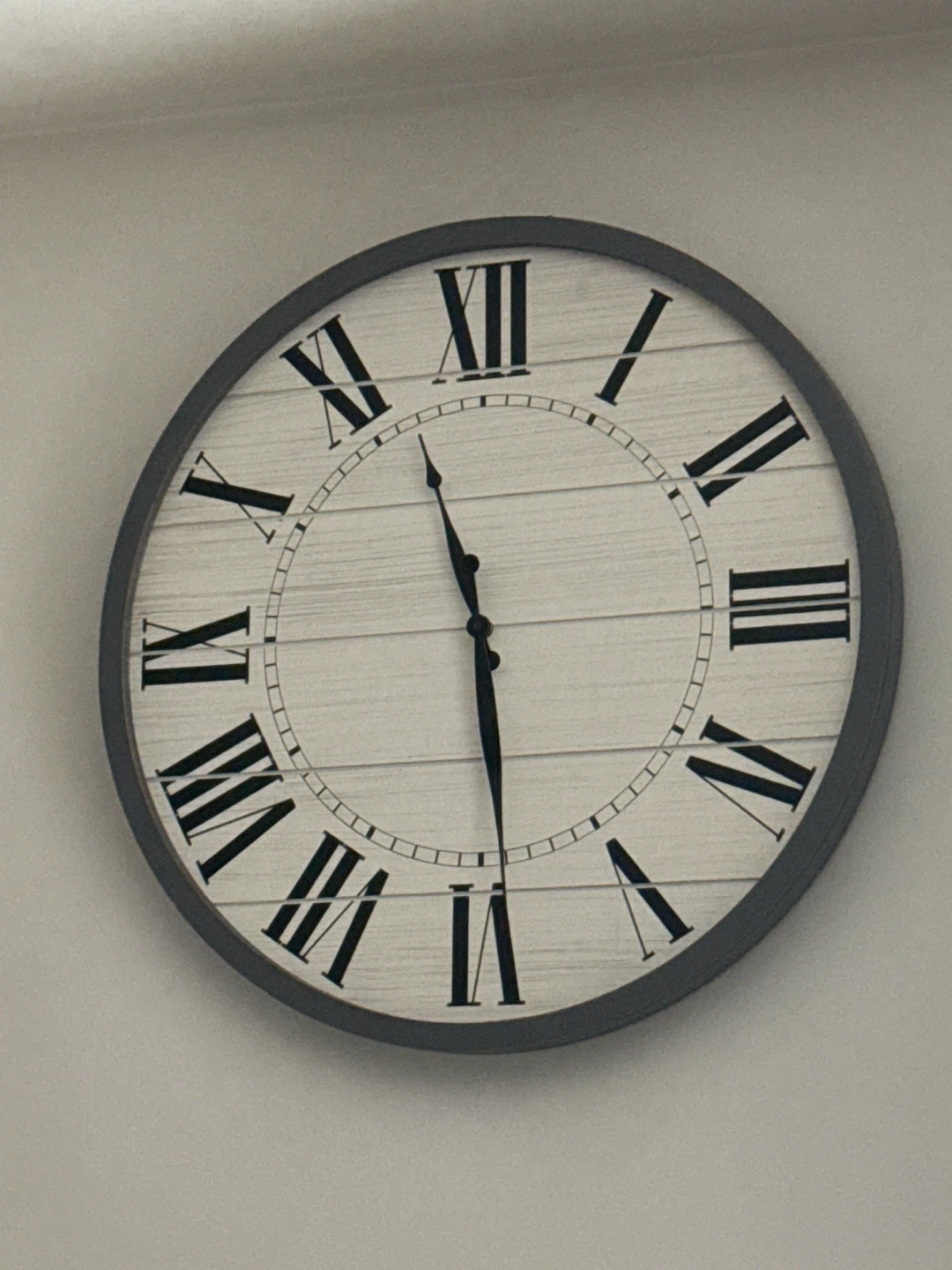 A stylish wall clock featuring Roman numerals. Its grey frame and whitewashed face add a rustic charm to any room. This clock's classic design is easy to read from across the space.