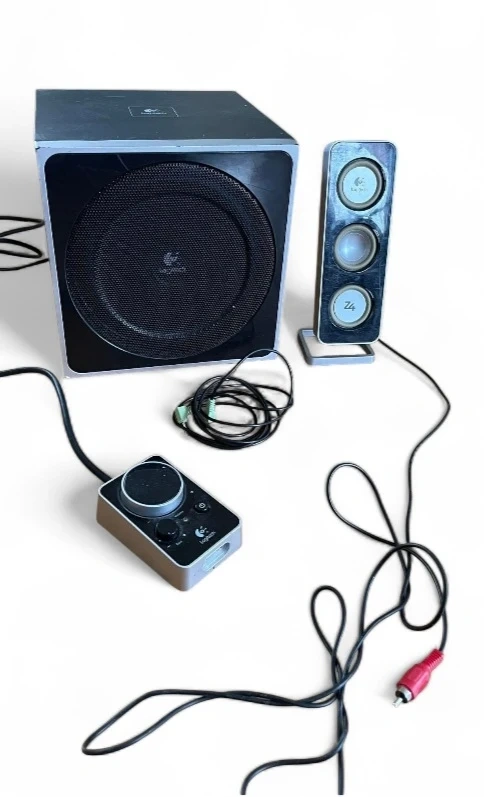 Logitech Z4 2.1 speaker system with subwoofer and control pod. It includes two satellite speakers and one subwoofer. The system has a dedicated control pod for volume and power. Great for desktop computer audio!