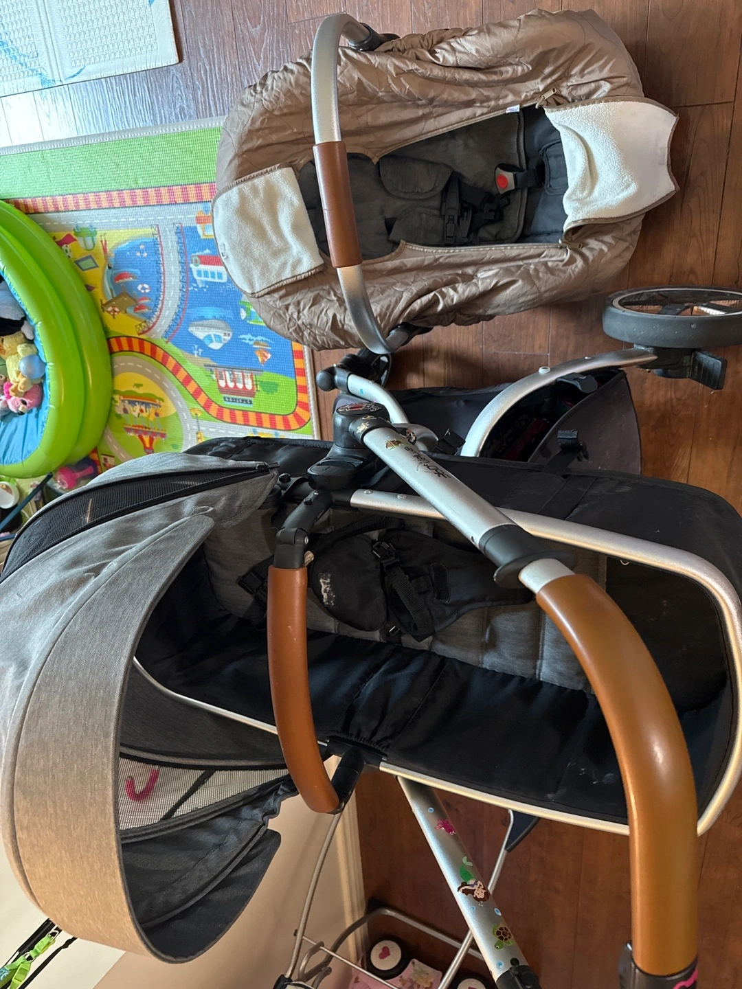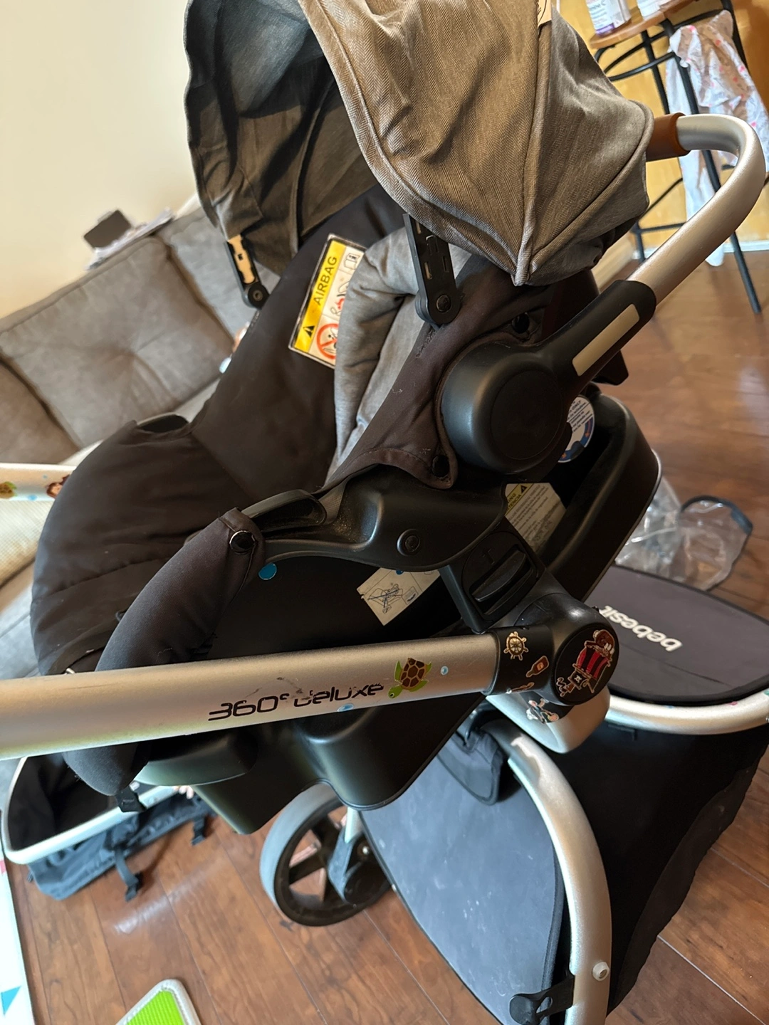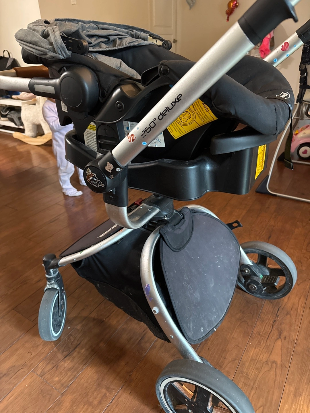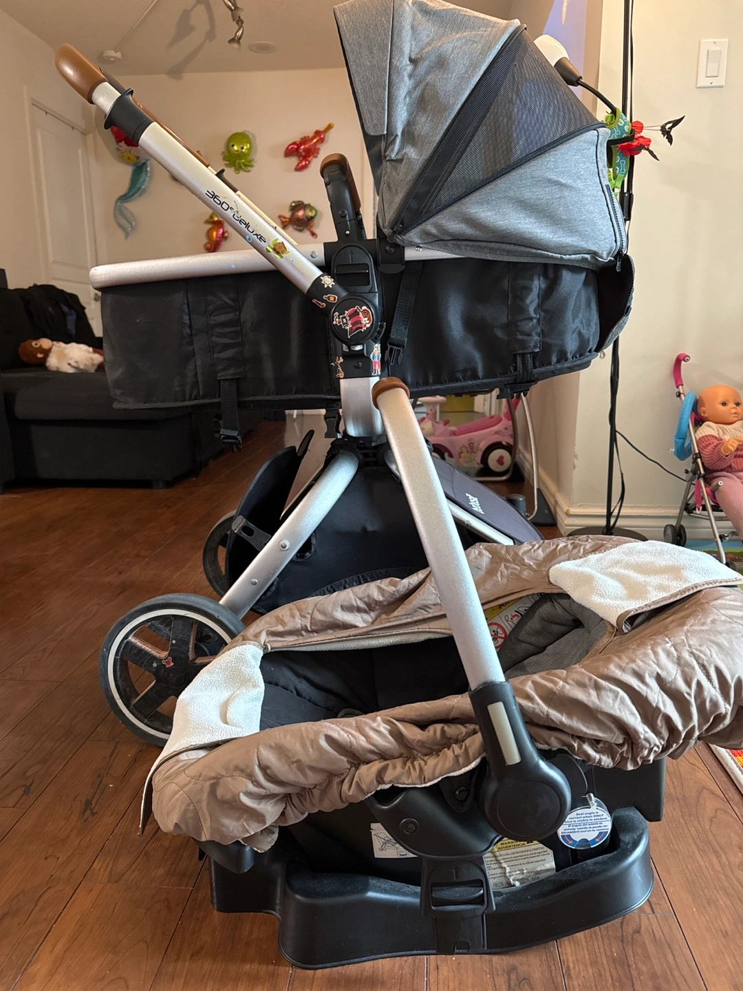 360 Deluxe stroller and infant car seat. Grey fabric. Lightweight aluminum frame. Includes bassinet and car seat adapters. Some minor wear.