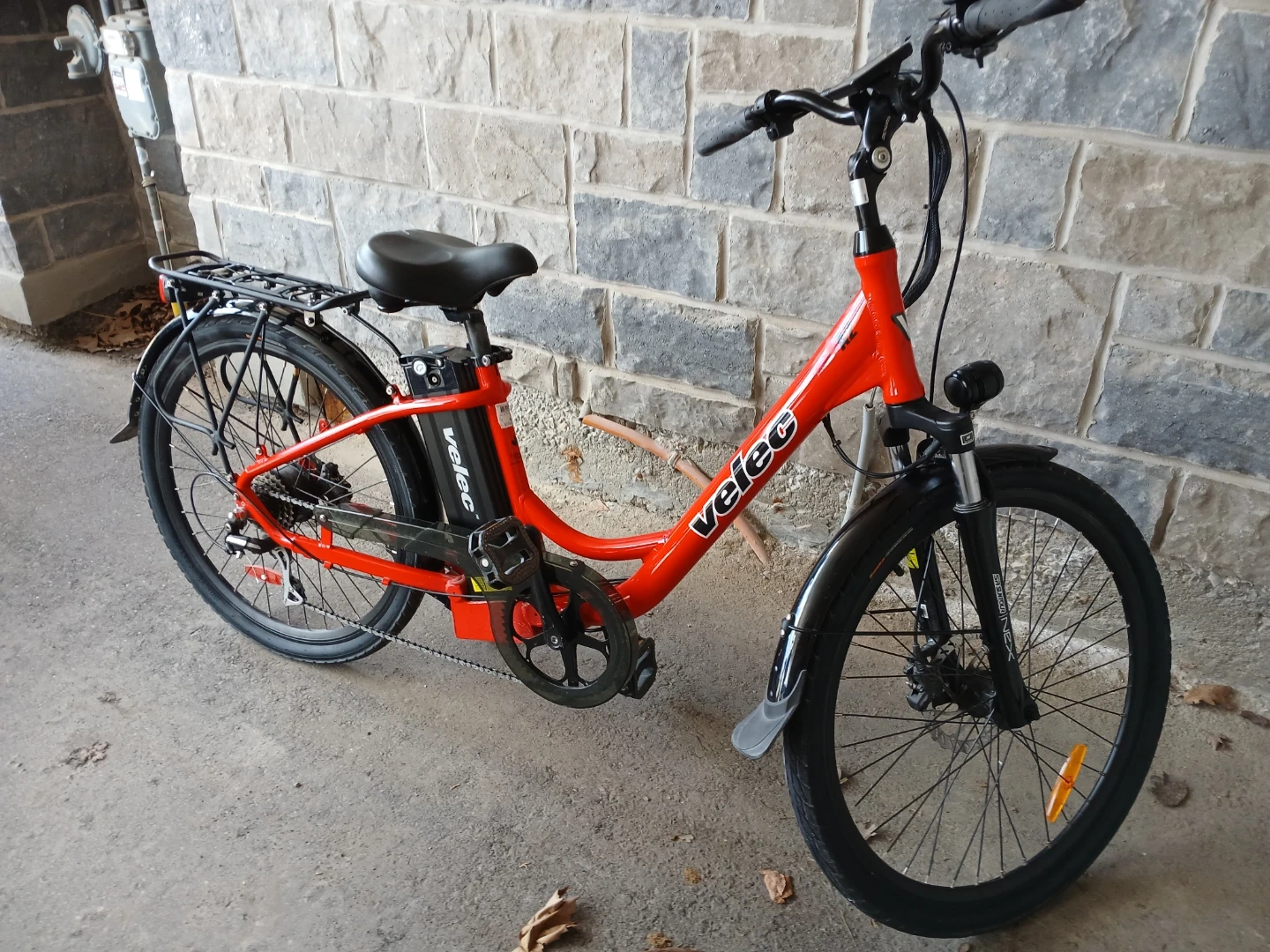 This is a Velec A2 electric bike in red. It's a step-through model with 26-inch wheels. It features hydraulic disc brakes and a Shimano 8-speed derailleur. The bike is designed in Canada.E-Bike, Velec A2 Classic