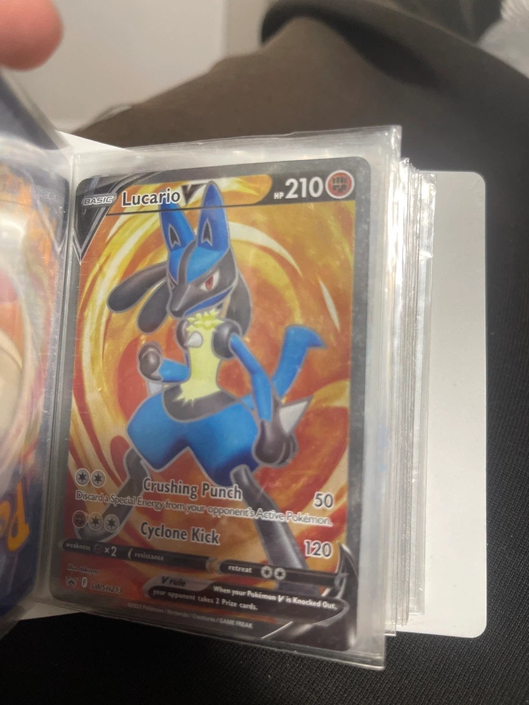 This is a Lucario V Pokemon trading card. It has 210 HP and features the attacks Crushing Punch and Cyclone Kick. Its V rule states that when your Pokemon V is Knocked Out, your opponent takes 2 Prize cards.