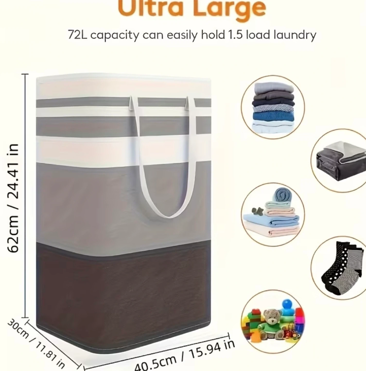 This is an ultra large laundry hamper with a 72L capacity, easily holding 1.5 loads of laundry. Dimensions are 62cm (height), 40.5cm (length), and 30cm (width). It's made of a fabric material and comes with handles for easy carrying.