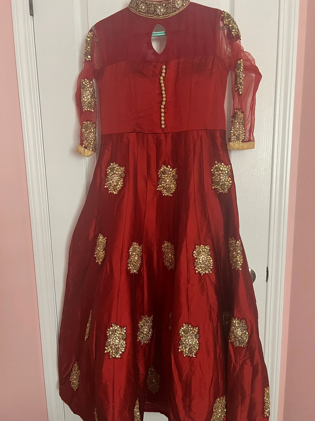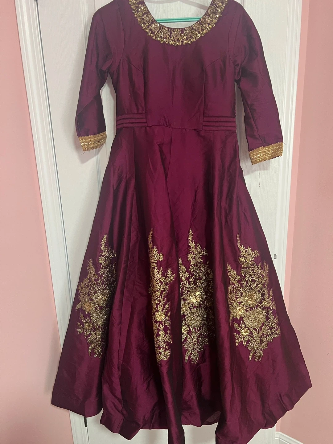 Gorgeous embroidered silk dresses in vibrant red and deep purple. Perfect for special occasions. Each dress features intricate gold thread work and embellishments.