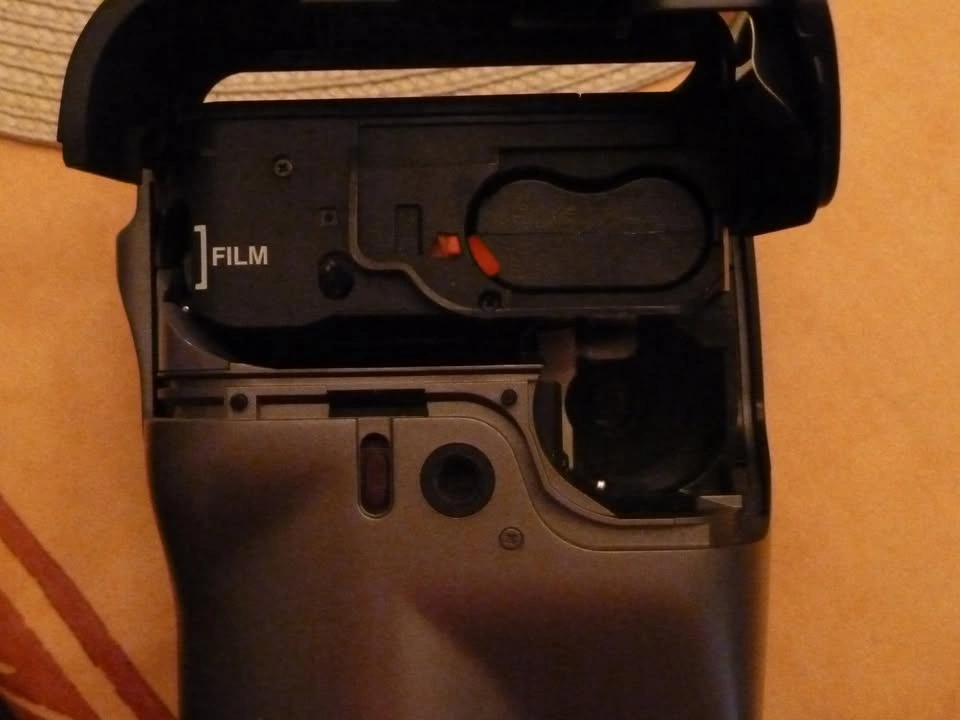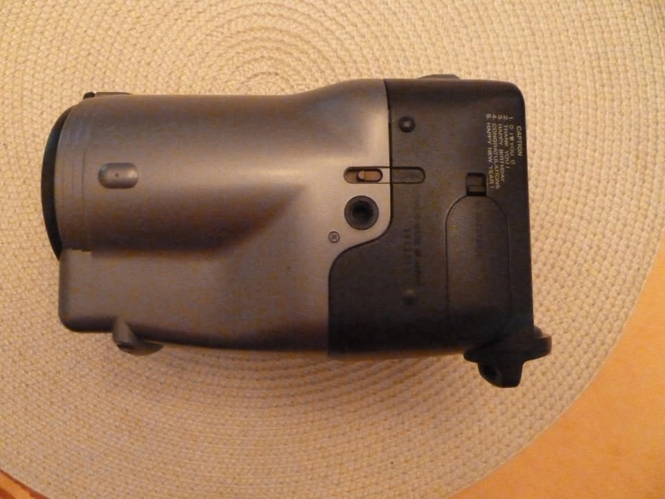 Feature-rich point and shoot 35mm camera shaped like a video camera so the long optical zoom remains enclosed. Easy to handle. All the controls are right in front of you. 35 - 105mm zoom 1:2.8 to 1:6.6 exposure rating. The flash moves in relation to the zoom! Adjust the view to match your prescription. There is even a little top view finder in case it is on a low tripod. Technically it is not an SLR because the viewfinder is in parallel to the lens. Barely used. It was my dad's last film camera. You'll need a battery. I don't think this one is rechargeable.