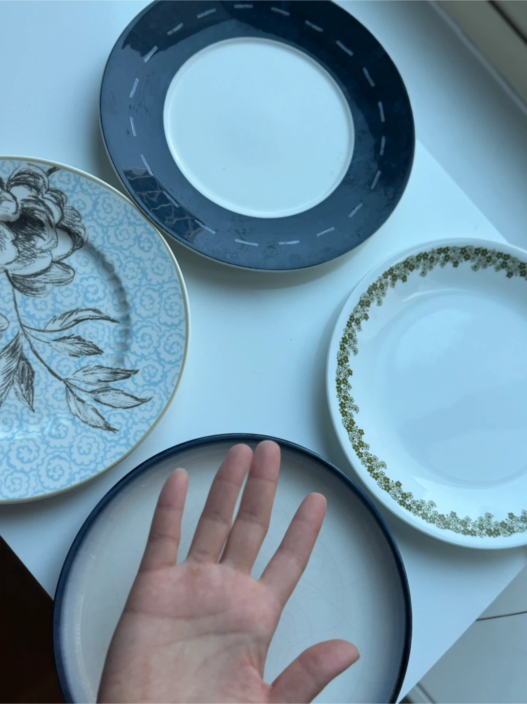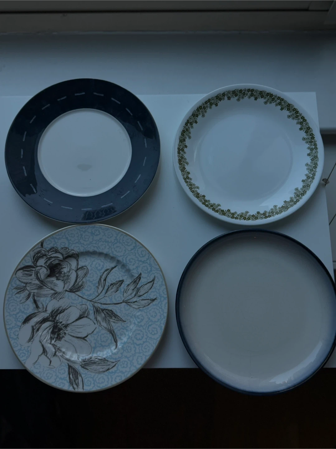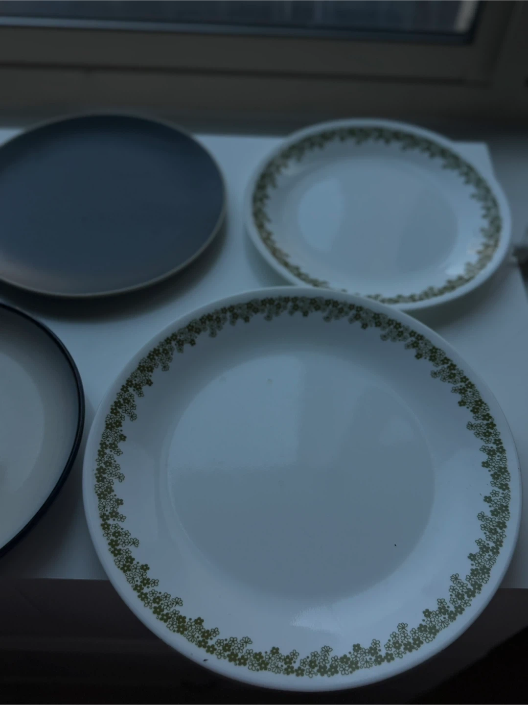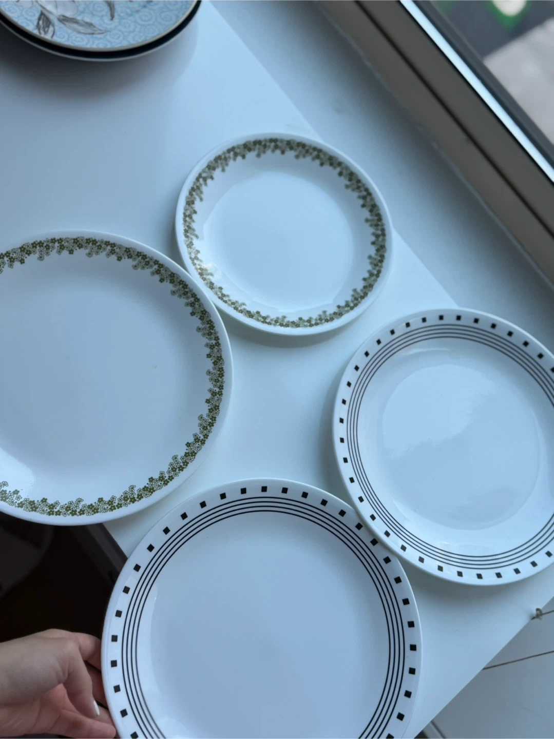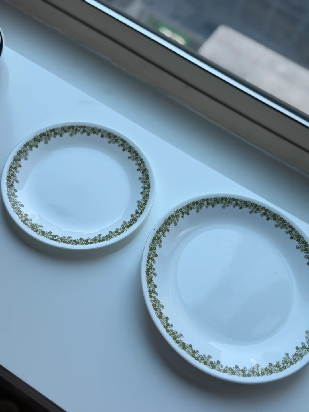 Set of four white Corelle plates. Each plate has a delicate green floral pattern around the rim. These are durable and lightweight.