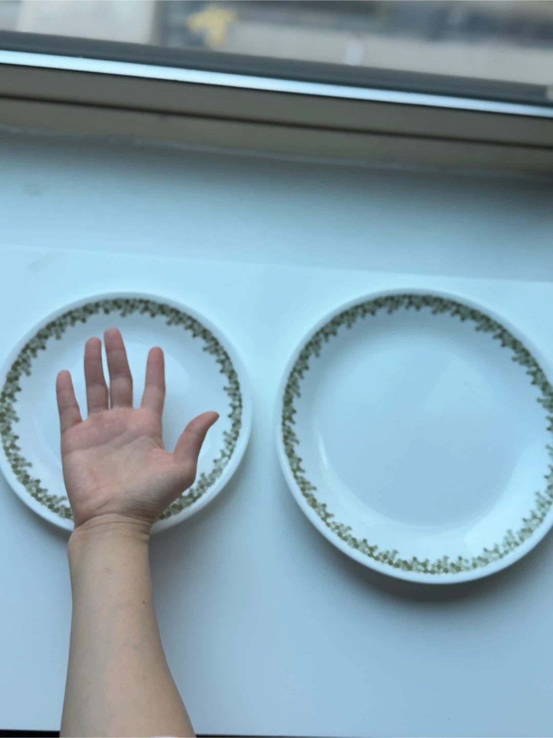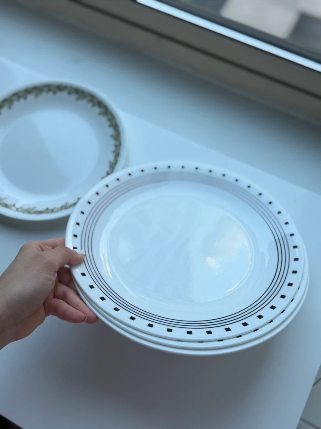 Set of four white Corelle plates. Each plate has a delicate green floral pattern around the rim. These are durable and lightweight.