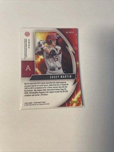 This is a standard size sports trading card featuring NCAA baseball player Casey Martin from the Arkansas Razorbacks. It's from the 2020 Panini Prizm Draft Picks set and is made of card stock. The card is in near mint or better condition.