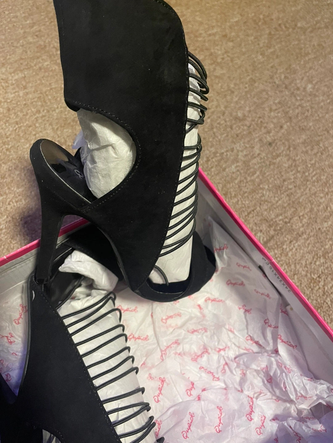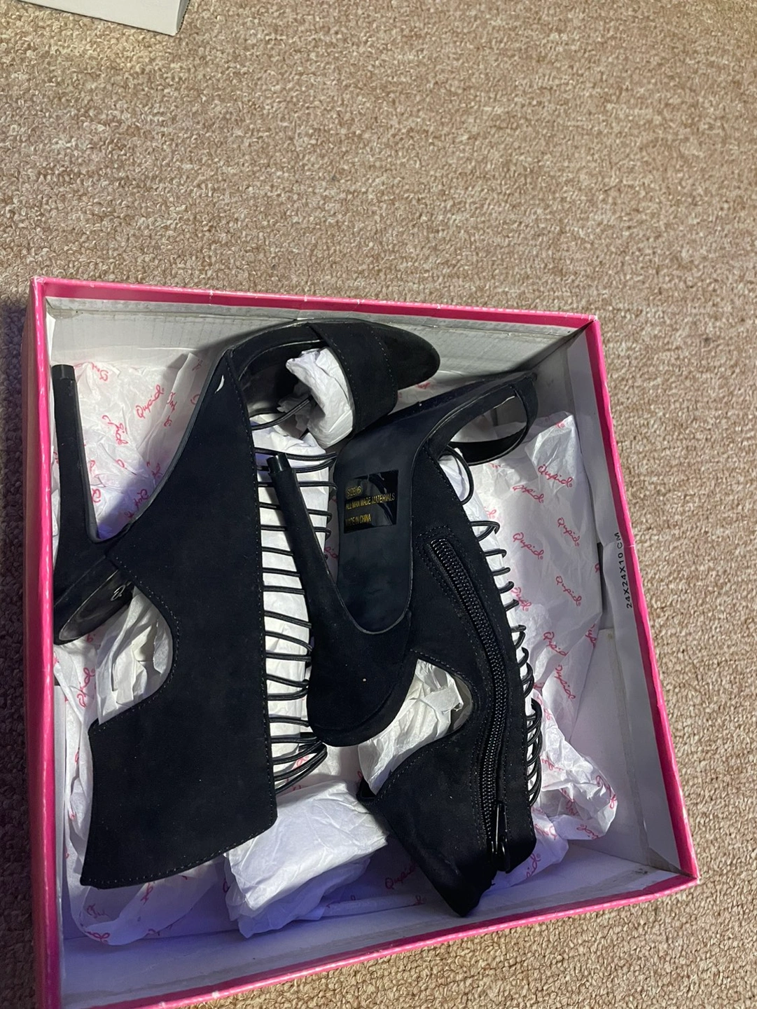 Suede open back heels with stretchy straps that run across the top of the foot. These heels are brand new as they have never been worn.
