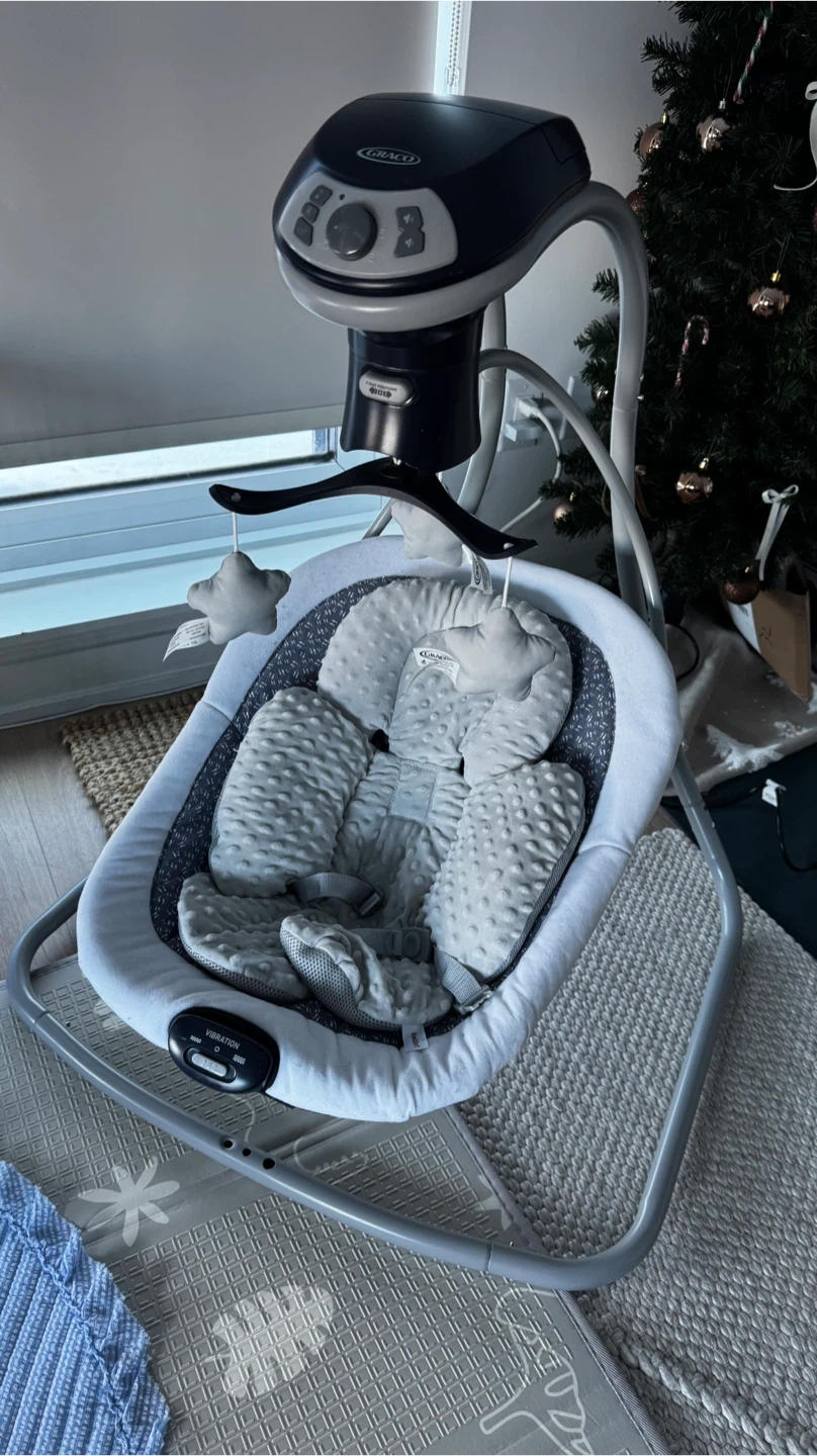 A Graco baby swing in a grey and white pattern. It's designed to soothe and entertain your little one. The swing has multiple speed settings and plays music. Newborn insert NOT included
