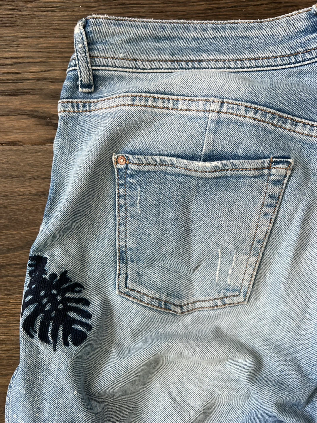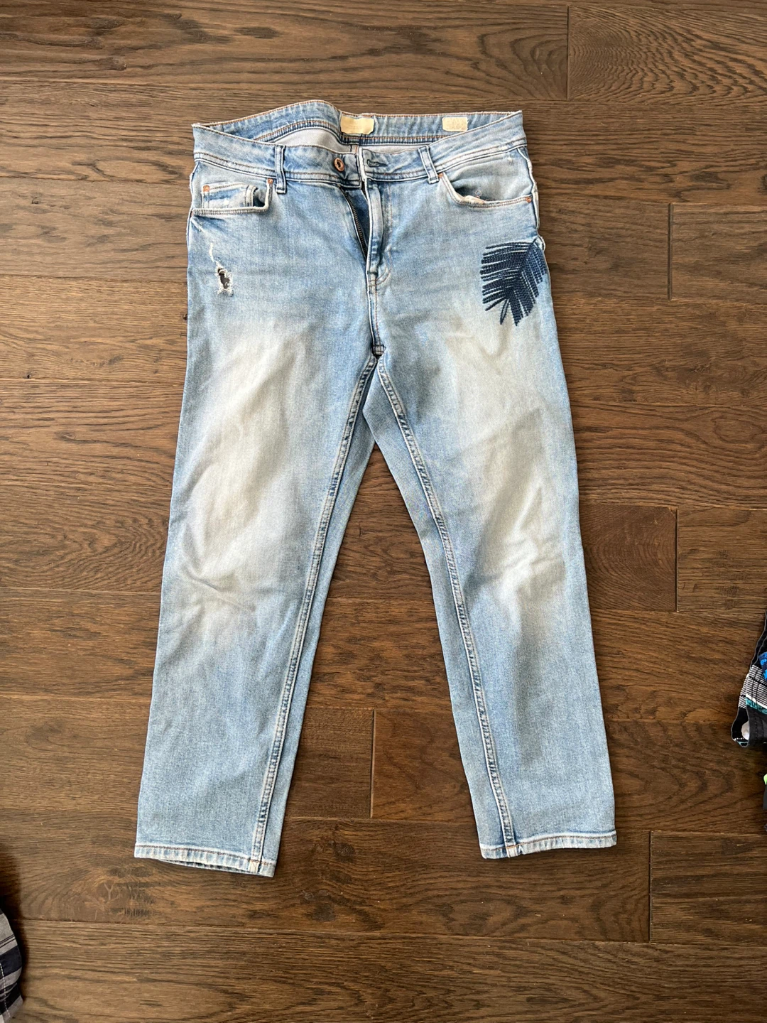Light wash denim jeans from COLIN'S Vintage Denim Co. Features distressed details and a palm leaf patch. These jeans would be a great addition to a casual wardrobe.