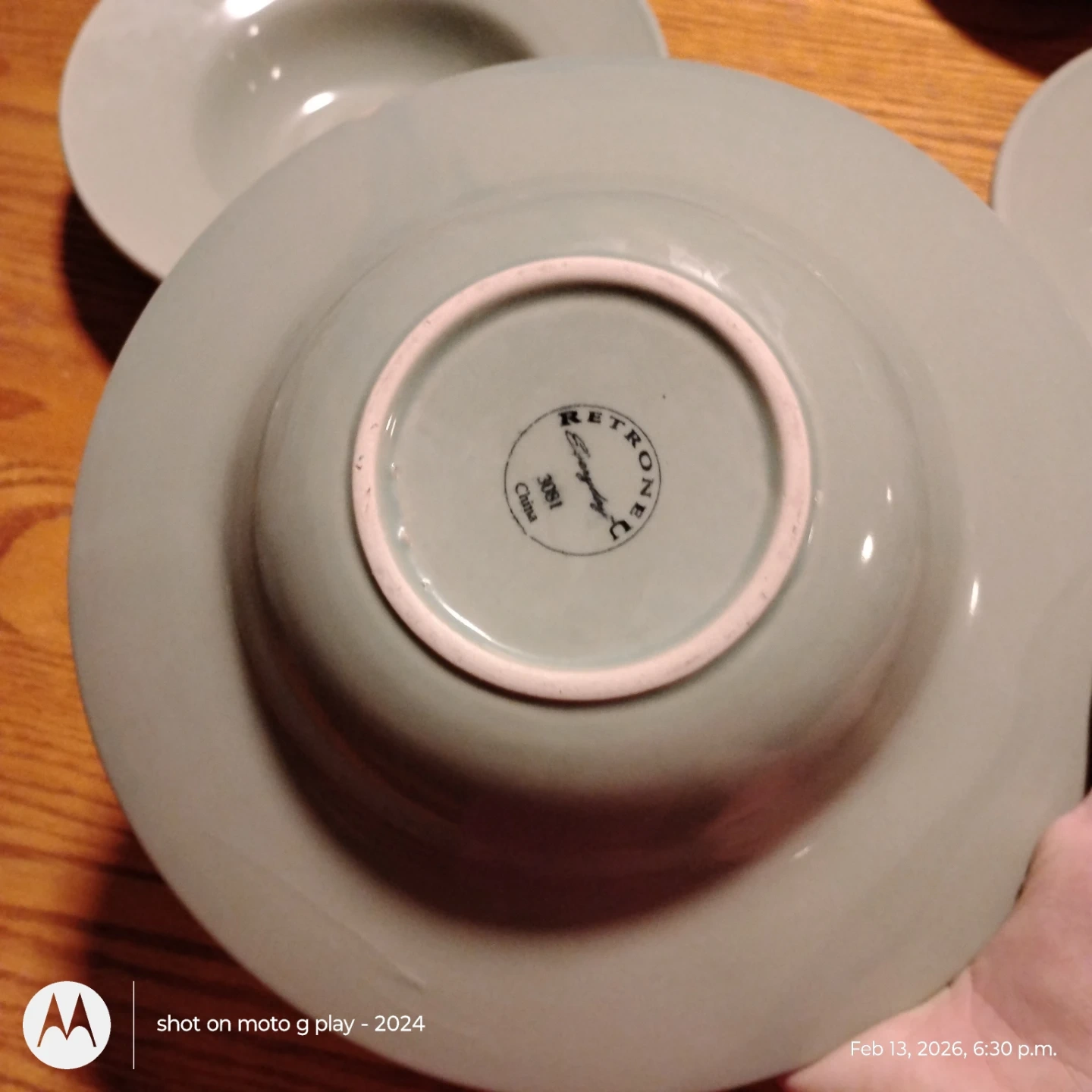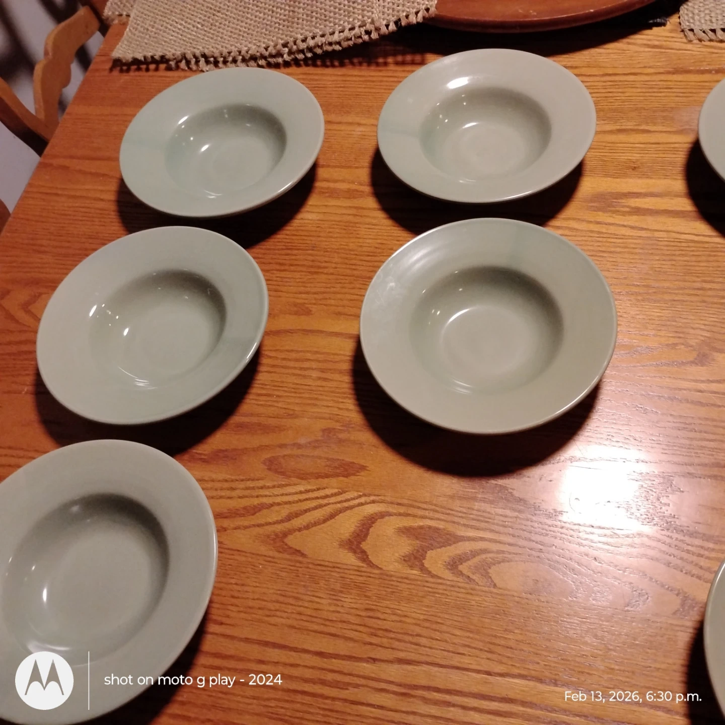 Set of 8 soup bowls in a light green colour. These are shallow bowls with a wide rim, perfect for pasta or soup. Made of ceramic and manufactured in China.