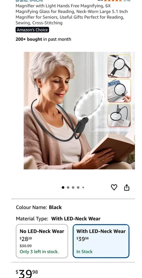 New neck-worn magnifier with a built-in light, offering 6X magnification and a large 5.1-inch lens. Perfect for reading, sewing, cross-stitching, and other detailed tasks. Makes a useful gift for seniors. Retails for $39.98, asking $20. Pick up near Coxwell and Danforth.