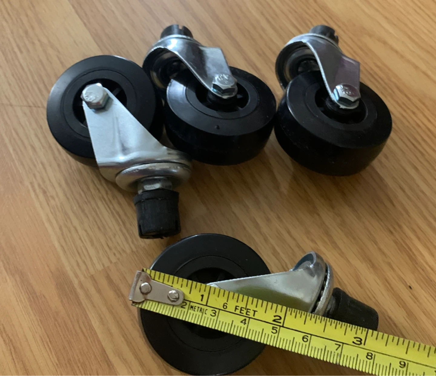Set of four black caster wheels with metal stems. Each wheel measures approximately 3 inches in diameter. These are great for replacing worn-out casters on furniture or equipment. Installation is a simple push-in design.