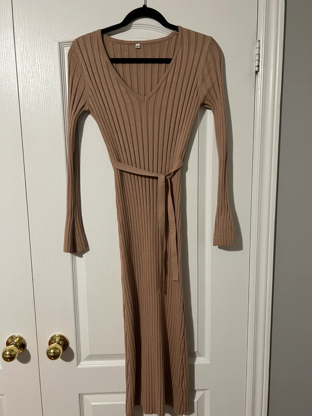 A long-sleeved ribbed knit midi/maxi dress in a tan colour. It features a V-neck and a matching removable belt. The material feels soft and stretchy.