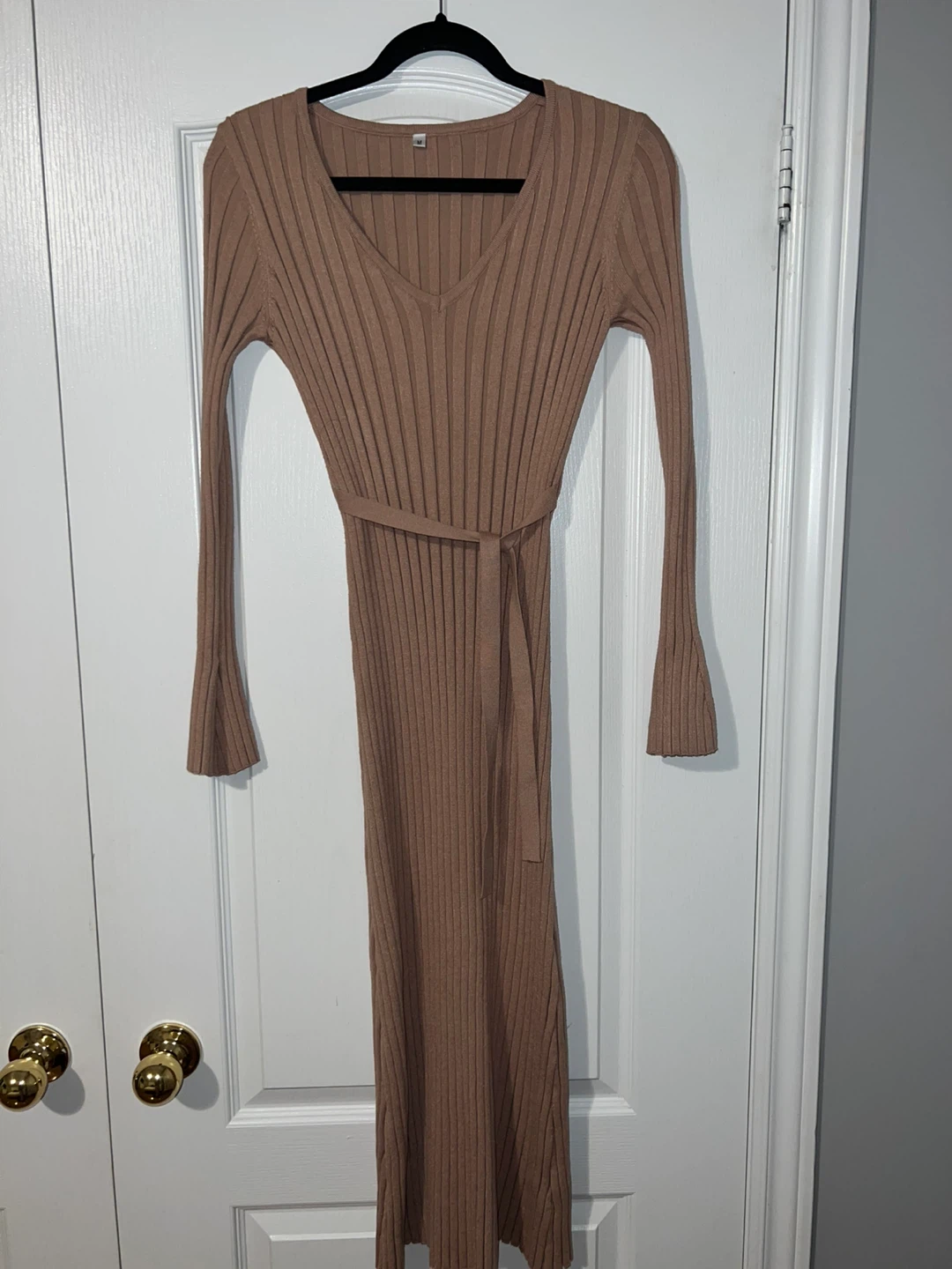 A long-sleeved ribbed knit midi/maxi dress in a tan colour. It features a V-neck and a matching removable belt. The material feels soft and stretchy.