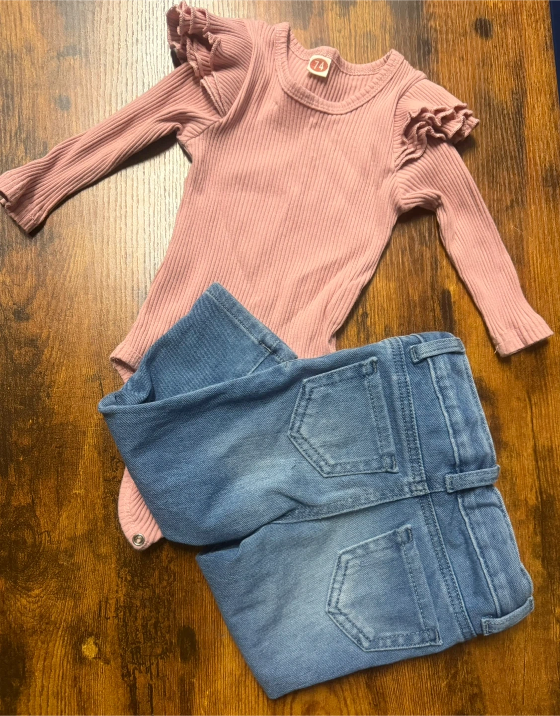 This adorable set includes a pink ribbed long-sleeve bodysuit with ruffled sleeves and a pair of blue denim jeans. It's perfect for a baby girl's everyday wear or special occasions!