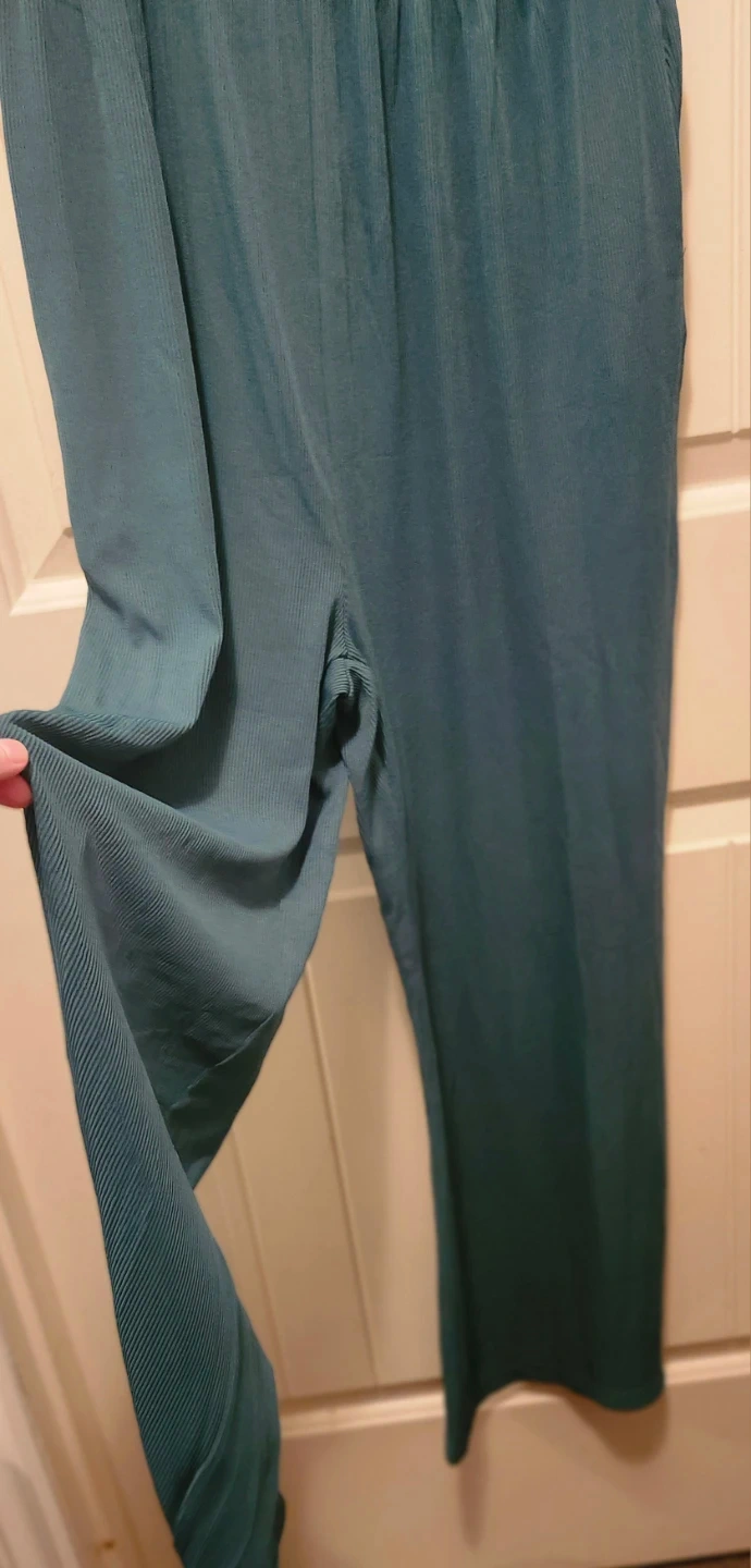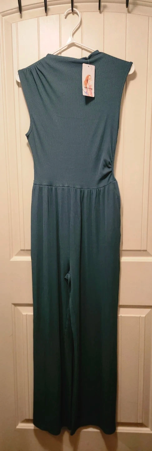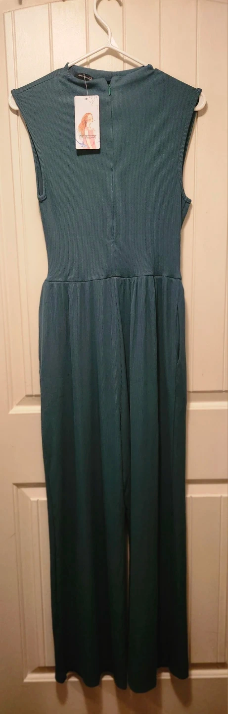 This green jumpsuit from PrettyGarden features a comfortable ribbed texture. It has a flattering silhouette with wide-leg pants and sleeveless design. Pockets are included for convenience.