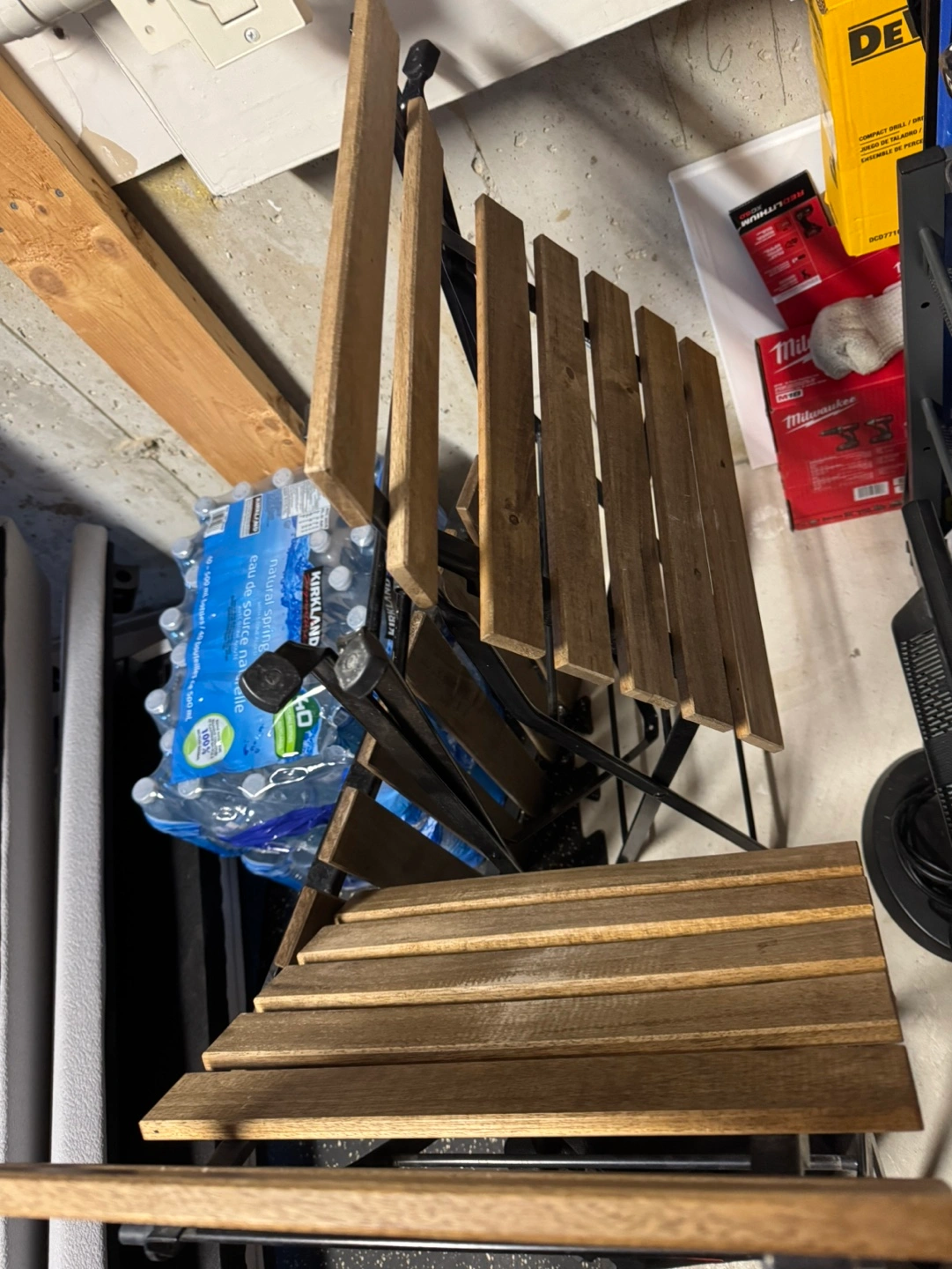 Foldable outdoor bistro set. Table and two chairs. Black metal frame. Light brown stained wooden slats. Great for small spaces or patios.m