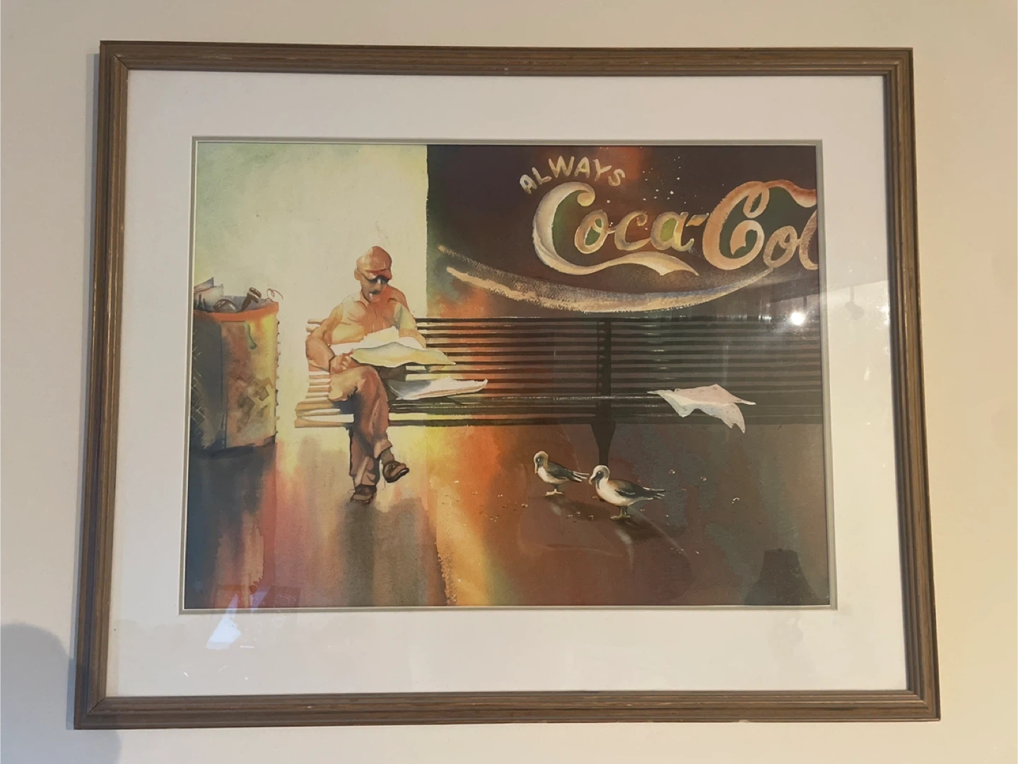 This framed painting features an "Always Coca-Cola" theme. The artwork depicts a person reading on a bench with a Coca-Cola sign in the background. It's a unique piece that adds character to any space.