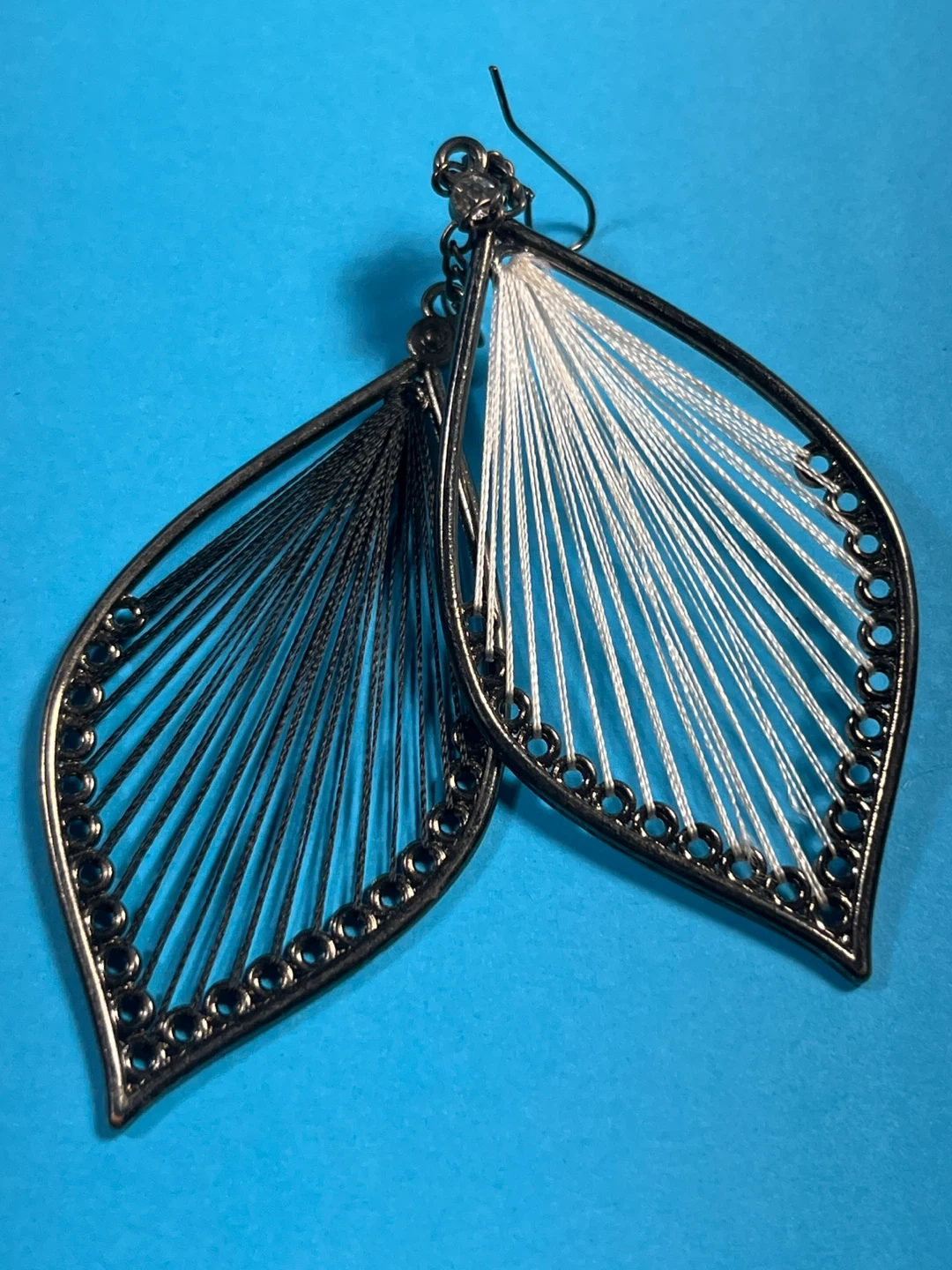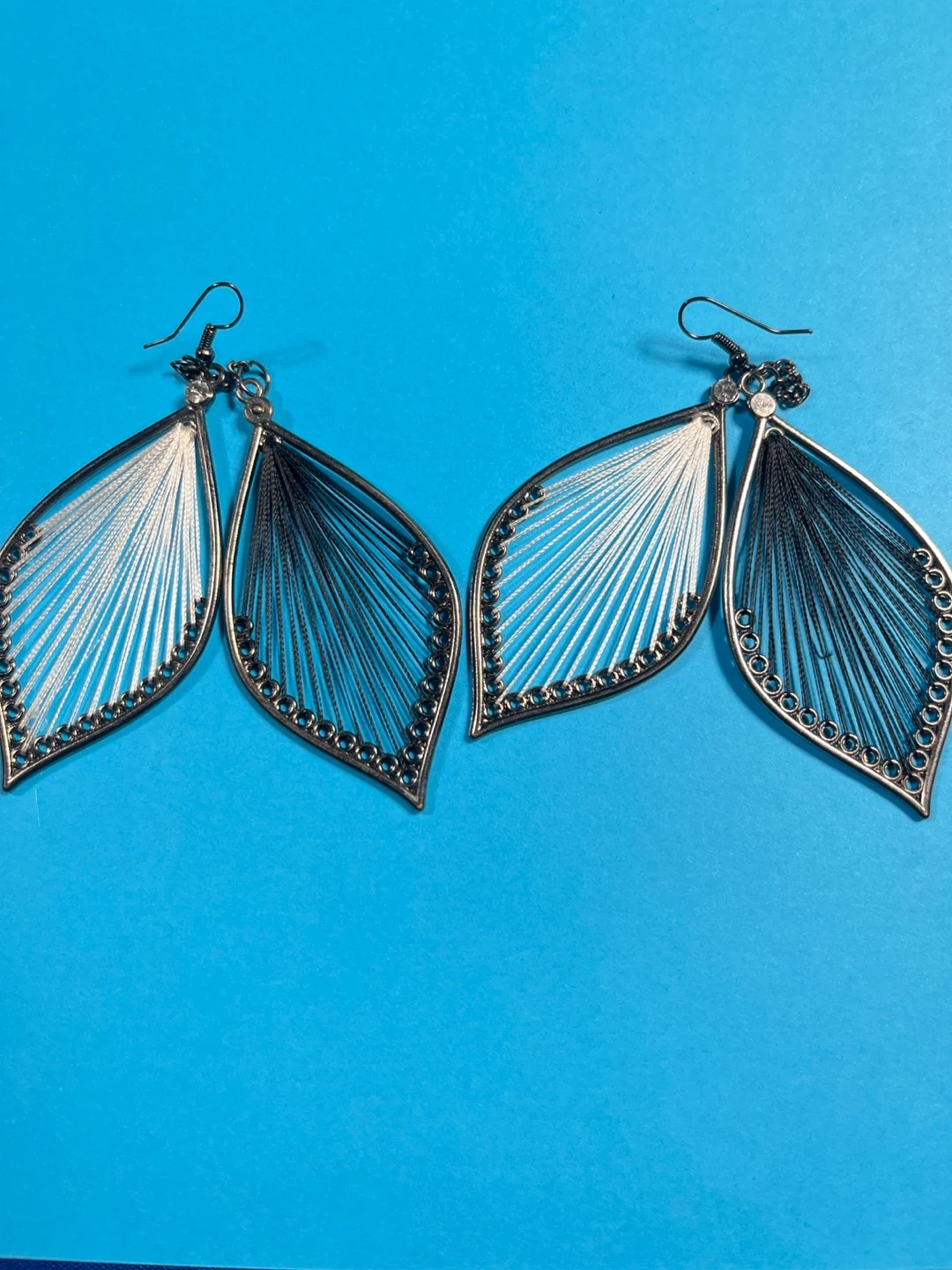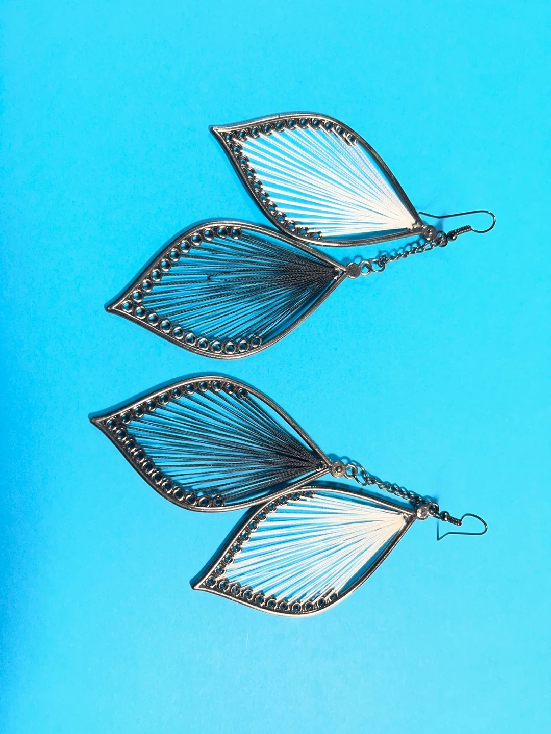 These stylish dangle earrings feature a layered feather and leaf design. They're made with a silver-tone metal frame and intricate white and black string detailing. Perfect for adding a touch of flair to any outfit!