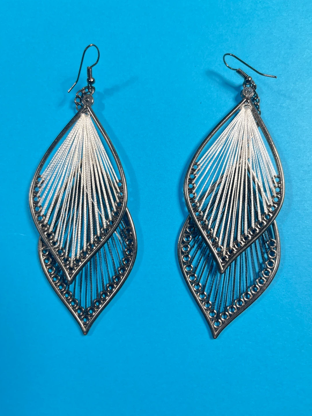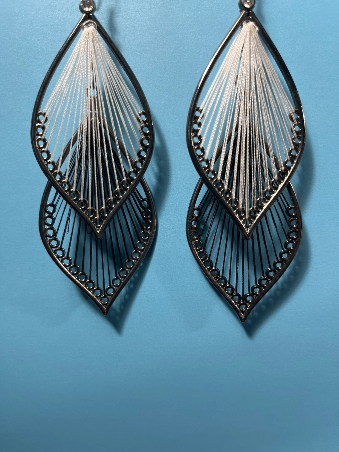 These stylish dangle earrings feature a layered feather and leaf design. They're made with a silver-tone metal frame and intricate white and black string detailing. Perfect for adding a touch of flair to any outfit!