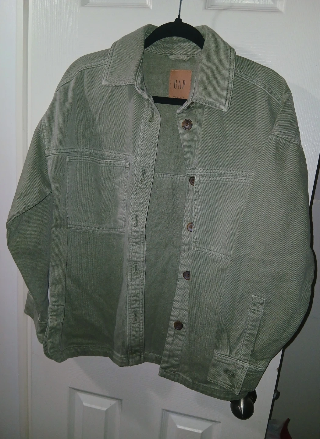 This is a Gap women's jacket in size XXS, but it's very oversized and can fit a couple sizes up. It's 100% cotton & never worn.