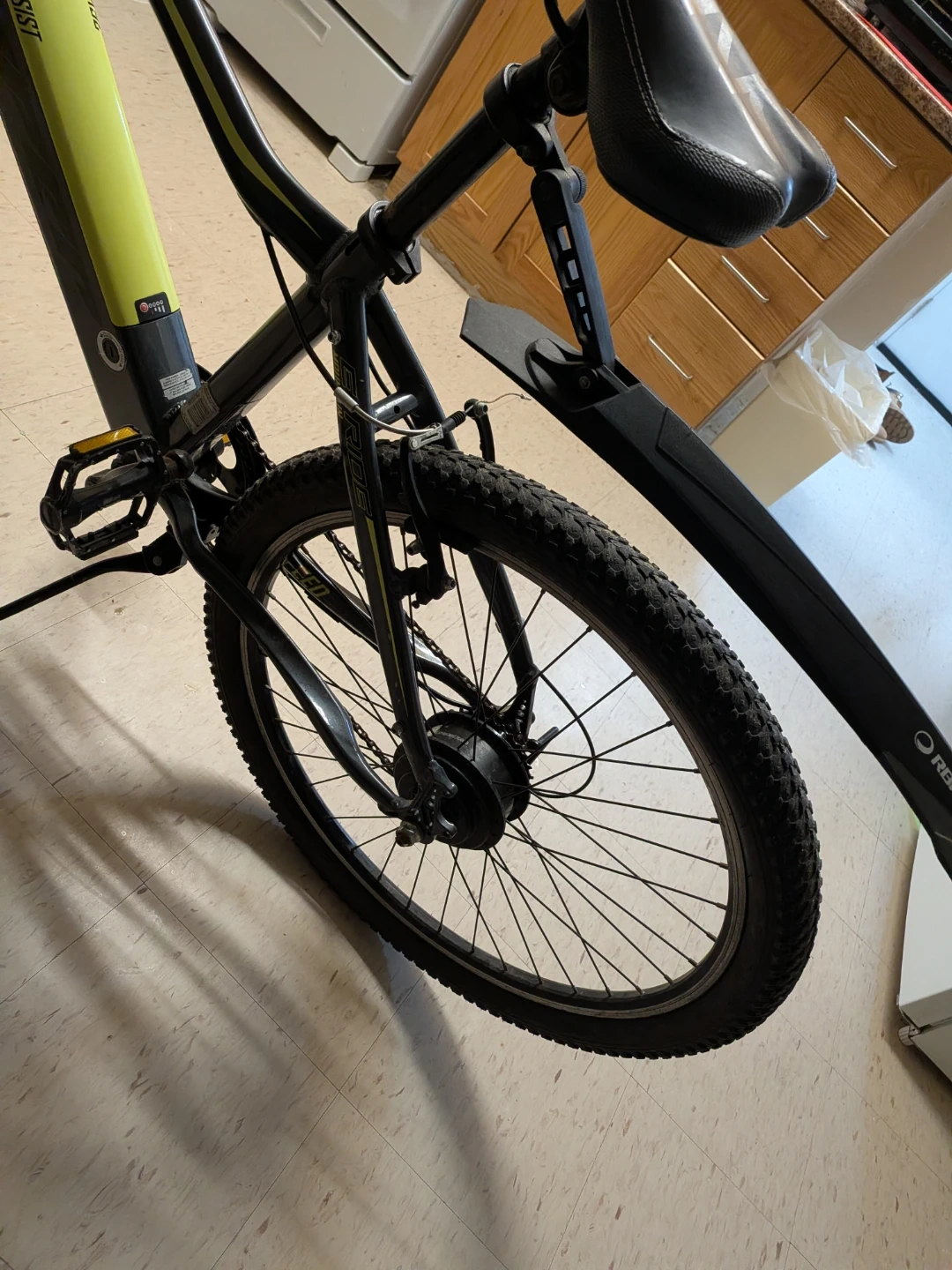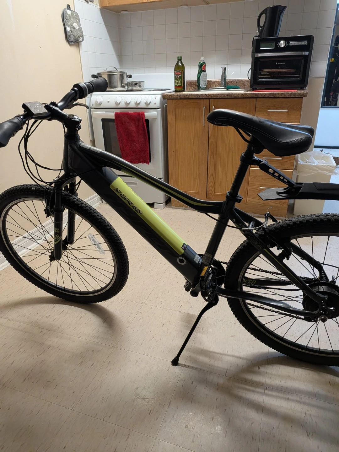 This is a black electric assist mountain bike with a 36V system. It features knobby tires suitable for trails and a front suspension fork. A rear fender is included for added protection. This bike is great for tackling varied terrain with ease!
