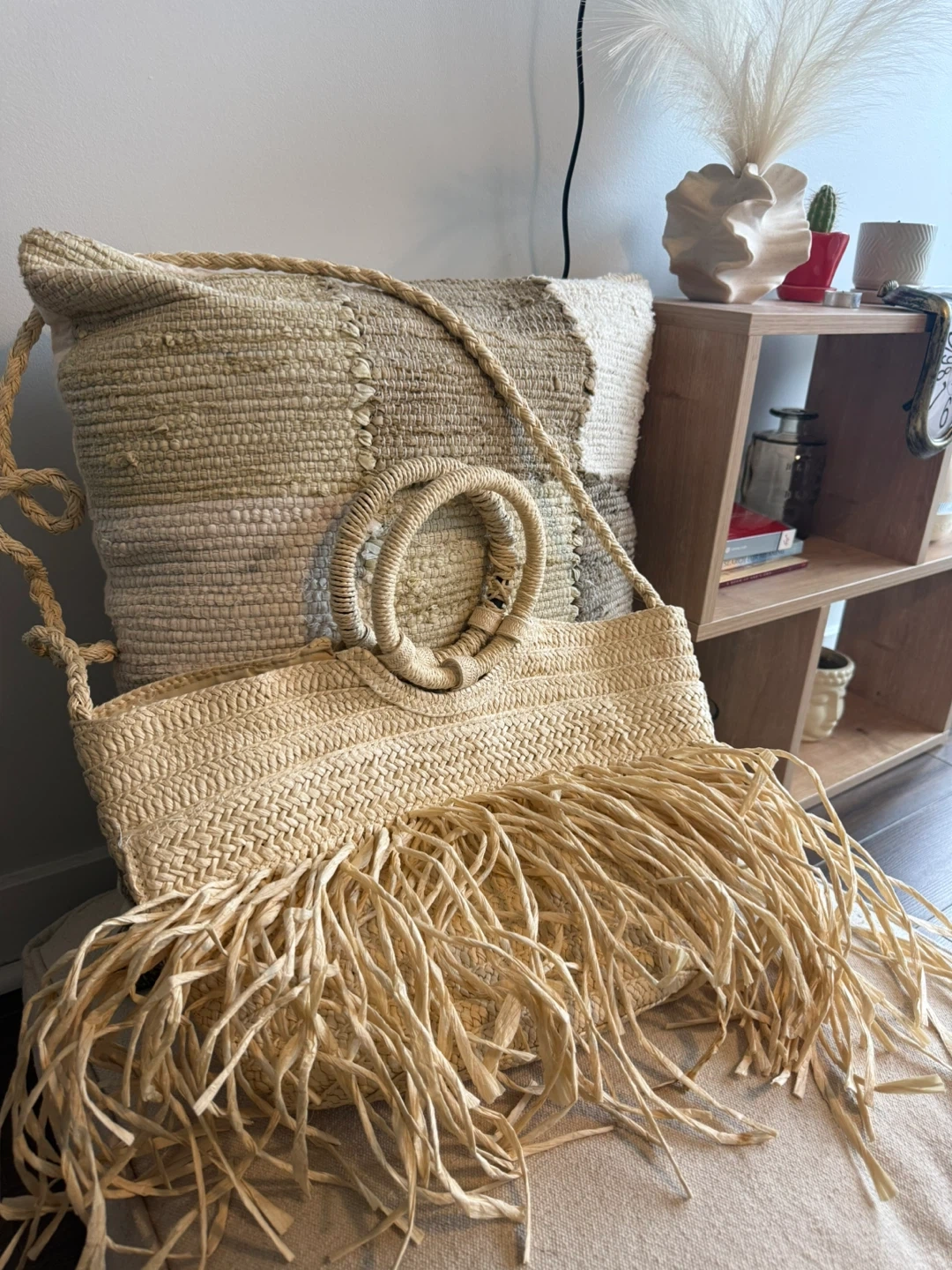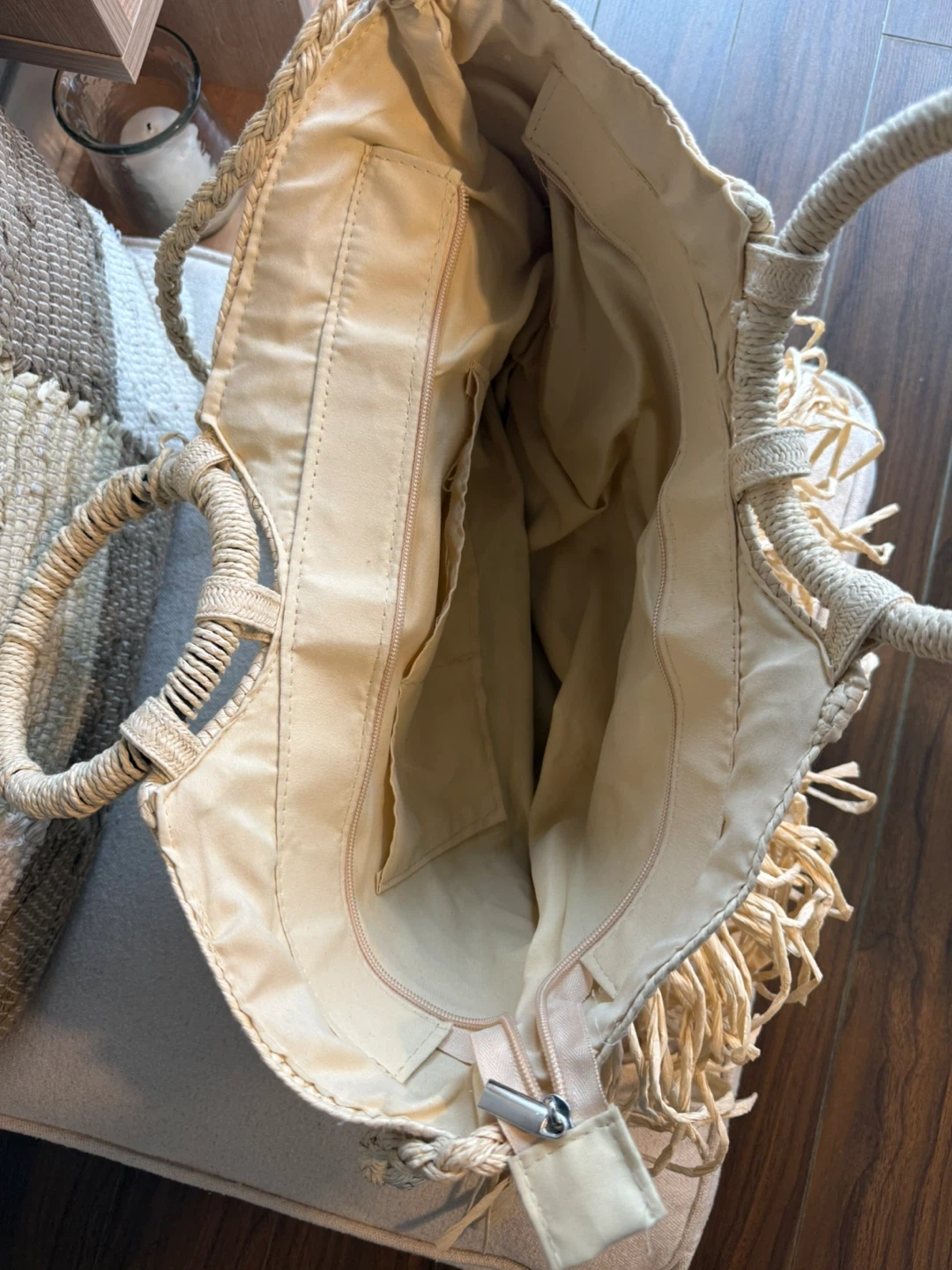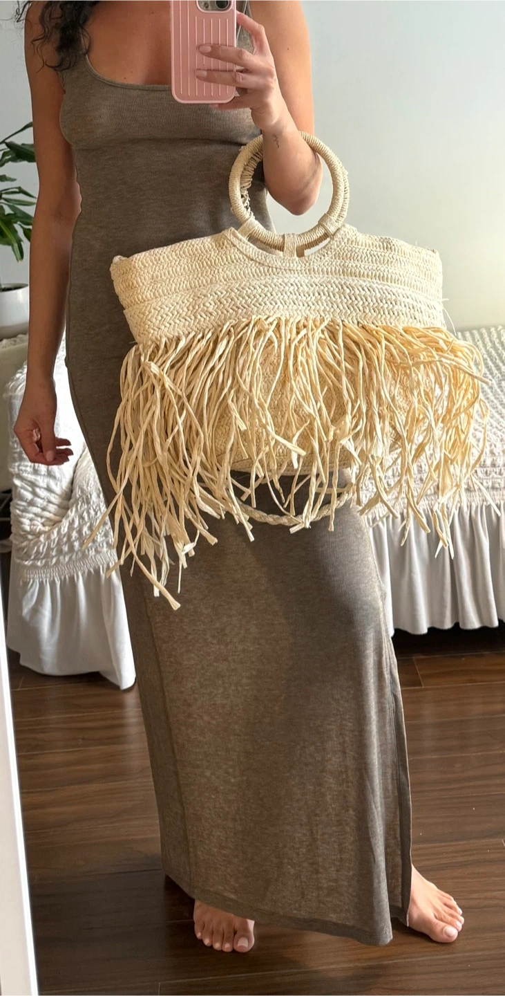 Straw tote bag featuring fun fringes and stylish round handles. It has a zippered main compartment and interior pockets for organization. Perfect for a beach day or casual outings!