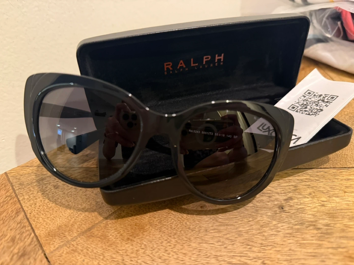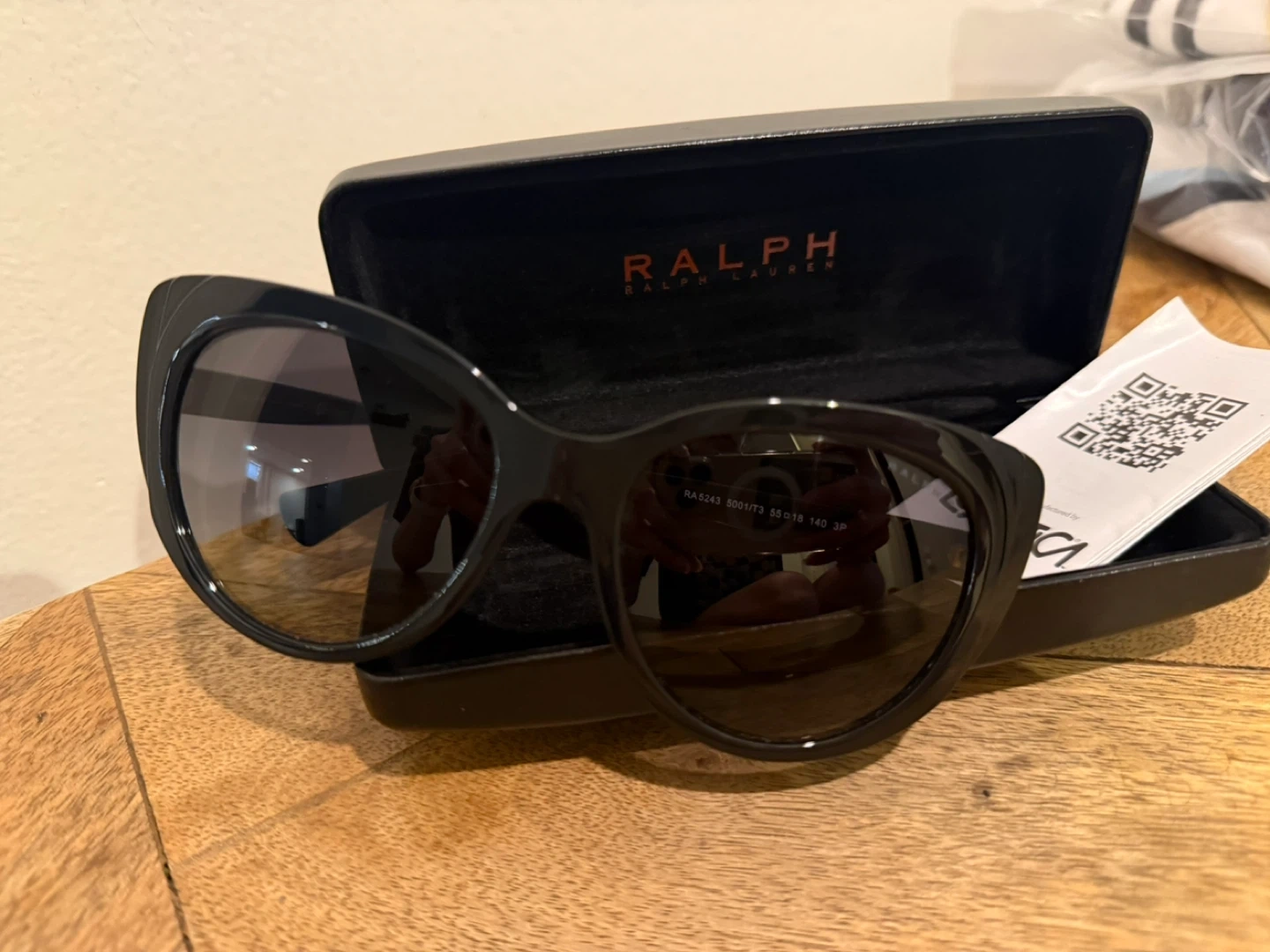These are black cat-eye sunglasses from Ralph Lauren. They come with their original hard case. The frames are glossy black plastic and feature the Ralph Lauren logo on the temples. This style is classic and chic!