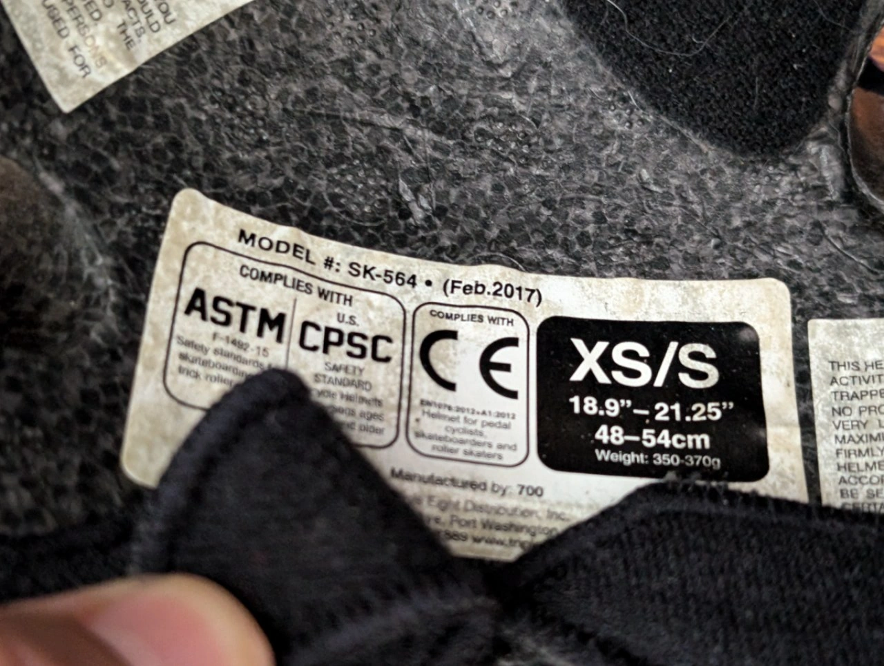 Purple Triple Eight skateboard helmet. It has an adjustable strap and is labelled as size XS/S. It has a sticker on the side that reads "Model # SK-564". It has multiple small scratches and marks on the outside. The size of the helmet is for a head circumference of 18.9-21.25 inches or 48-54 cm.
