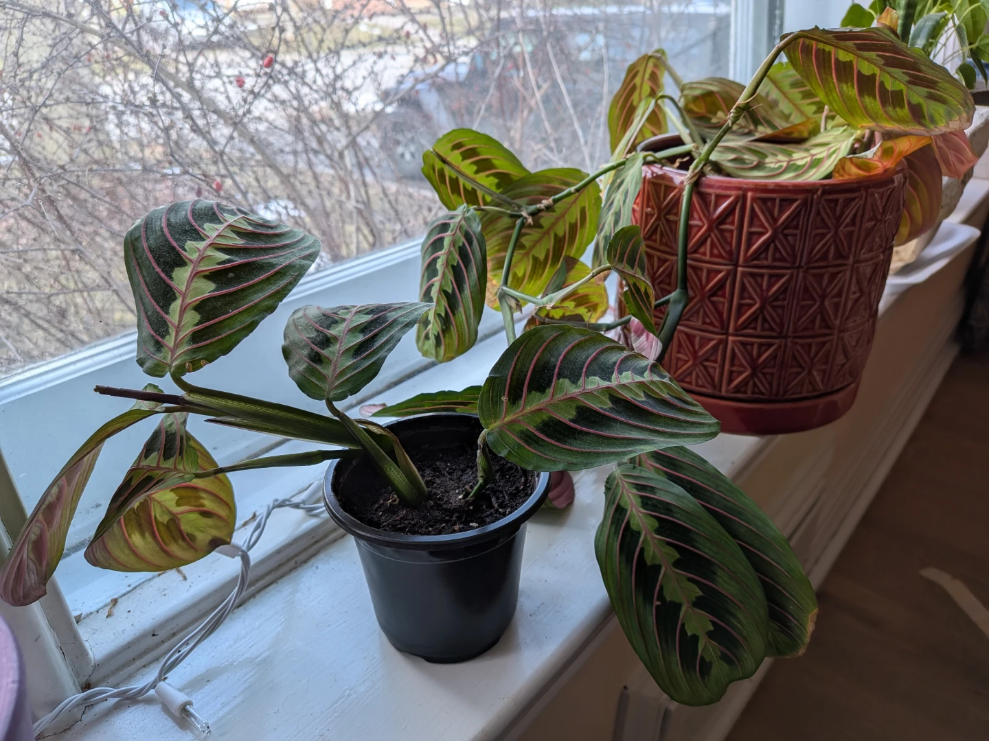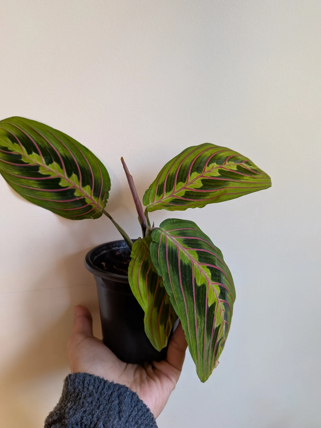 Bright red veins cutting through the deep green leaves. This plant's leaves fold up at night, resembling praying hands. Open to trade (looking for more plants with colourful leaves, no pothos and aloe please).