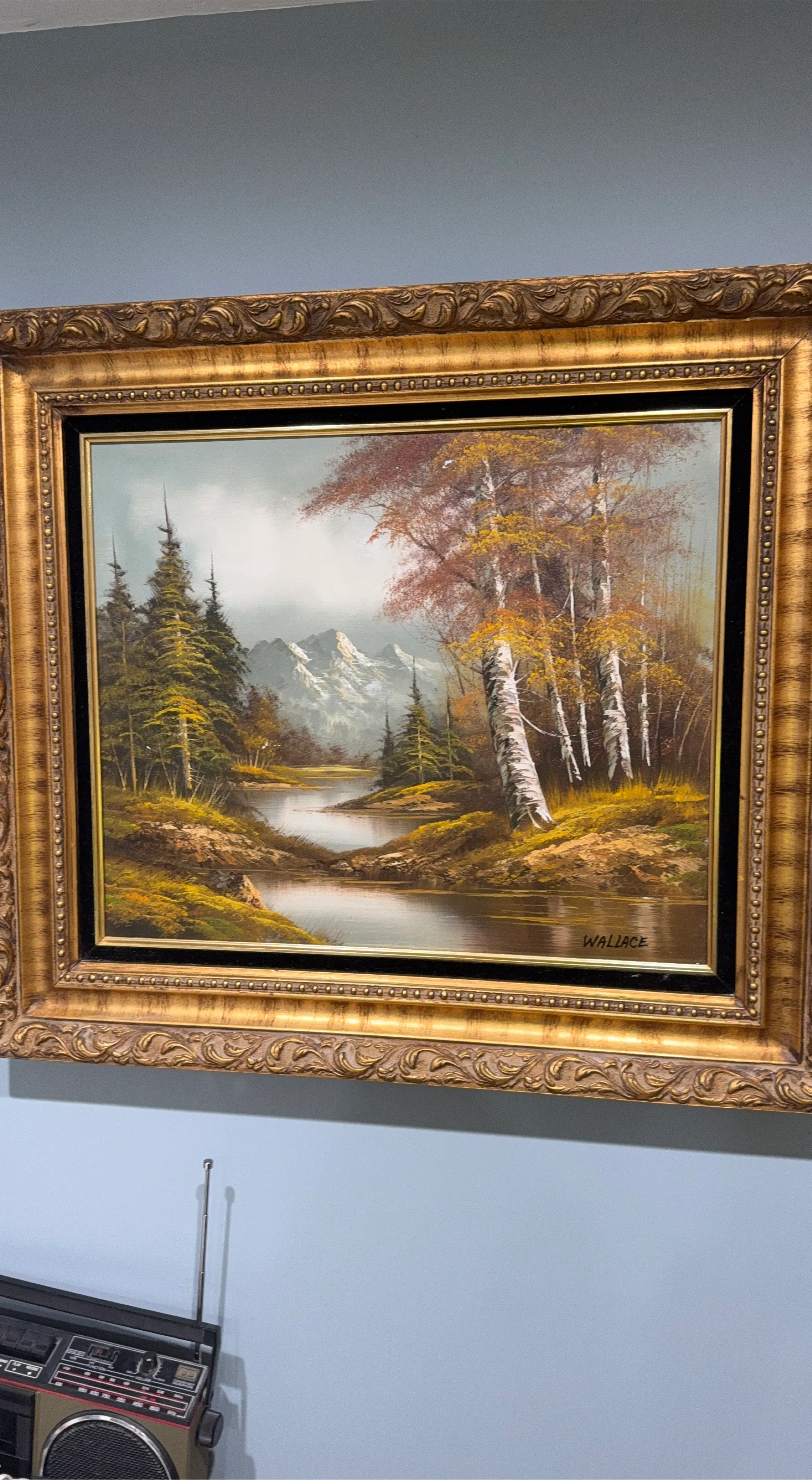 Oil painting depicting a serene landscape with a river, pine trees, and mountains. The artwork is signed 'Wallace'. It comes in an ornate, gold-colored frame with intricate detailing. This piece adds a touch of classic art to any room.