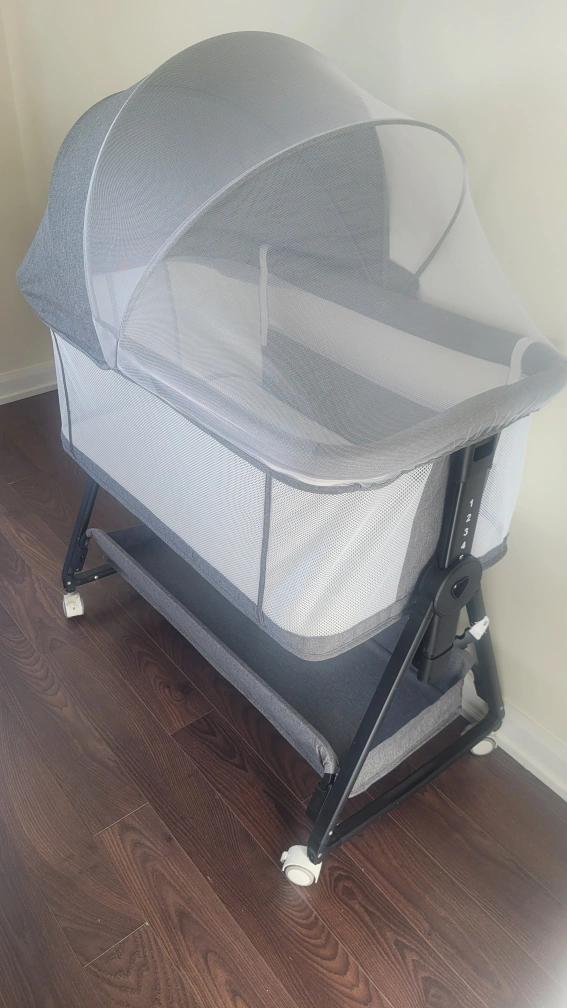 Grey fabric bassinet with stand and built-in storage shelf. Includes a mosquito net. Easy to fold and transport. Suitable for newborns.
