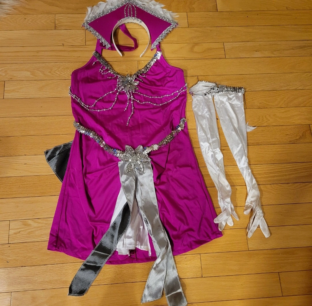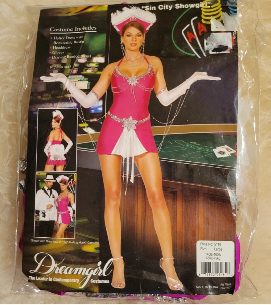 Get ready to shine in this Dreamgirl Sin City Showgirl Costume! This vibrant pink costume includes a halter dress with a removable bustle, a headpiece, gloves. It has everything listed in the package, except the the draping beaded shawl. Size Large, but will fit medium also, perfect for your next costume party or performance.