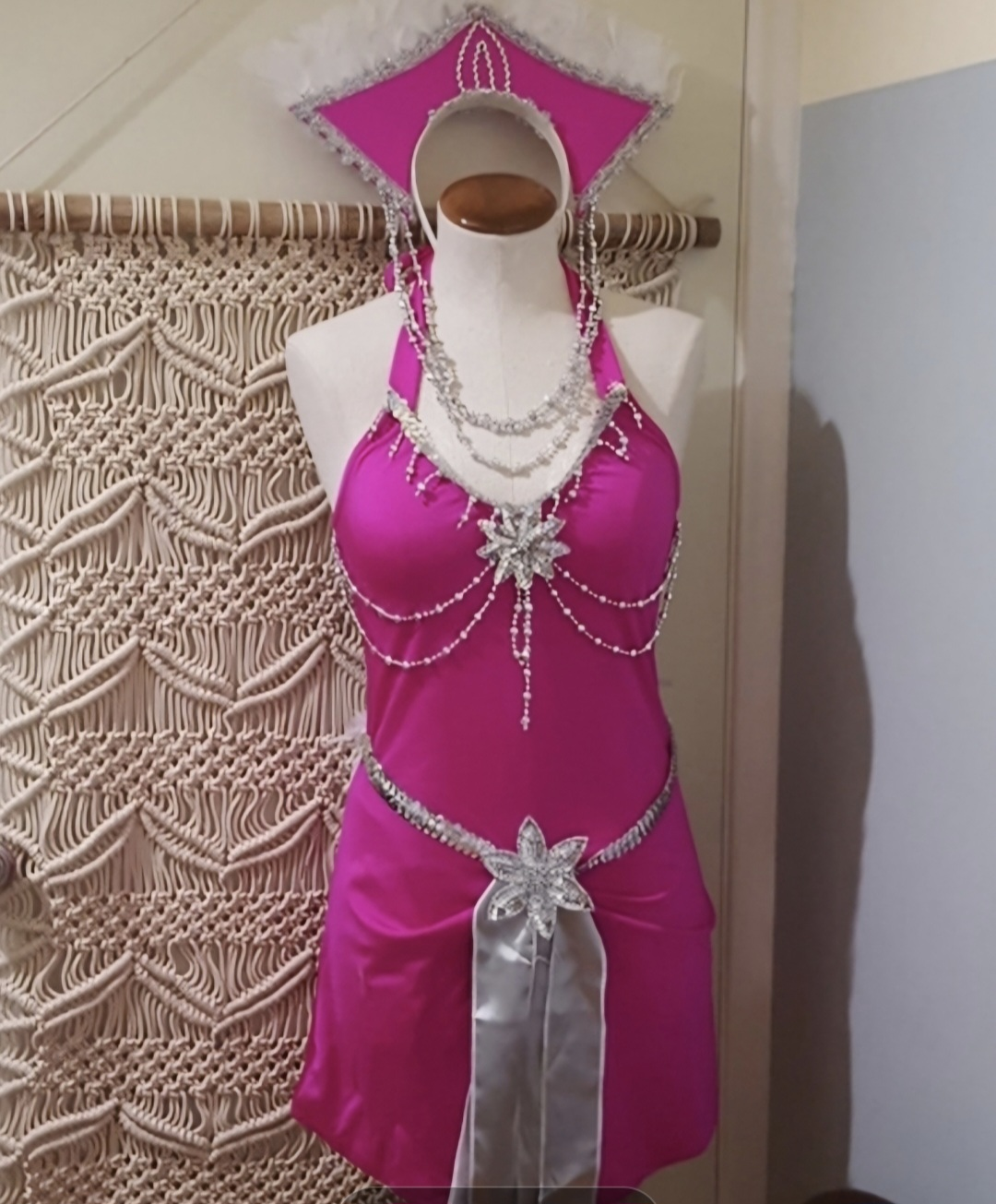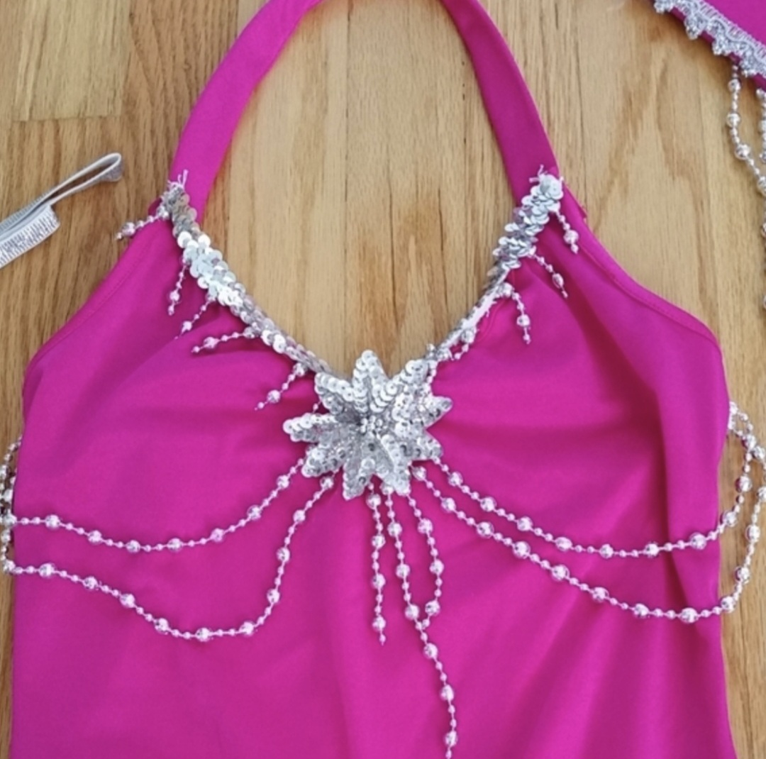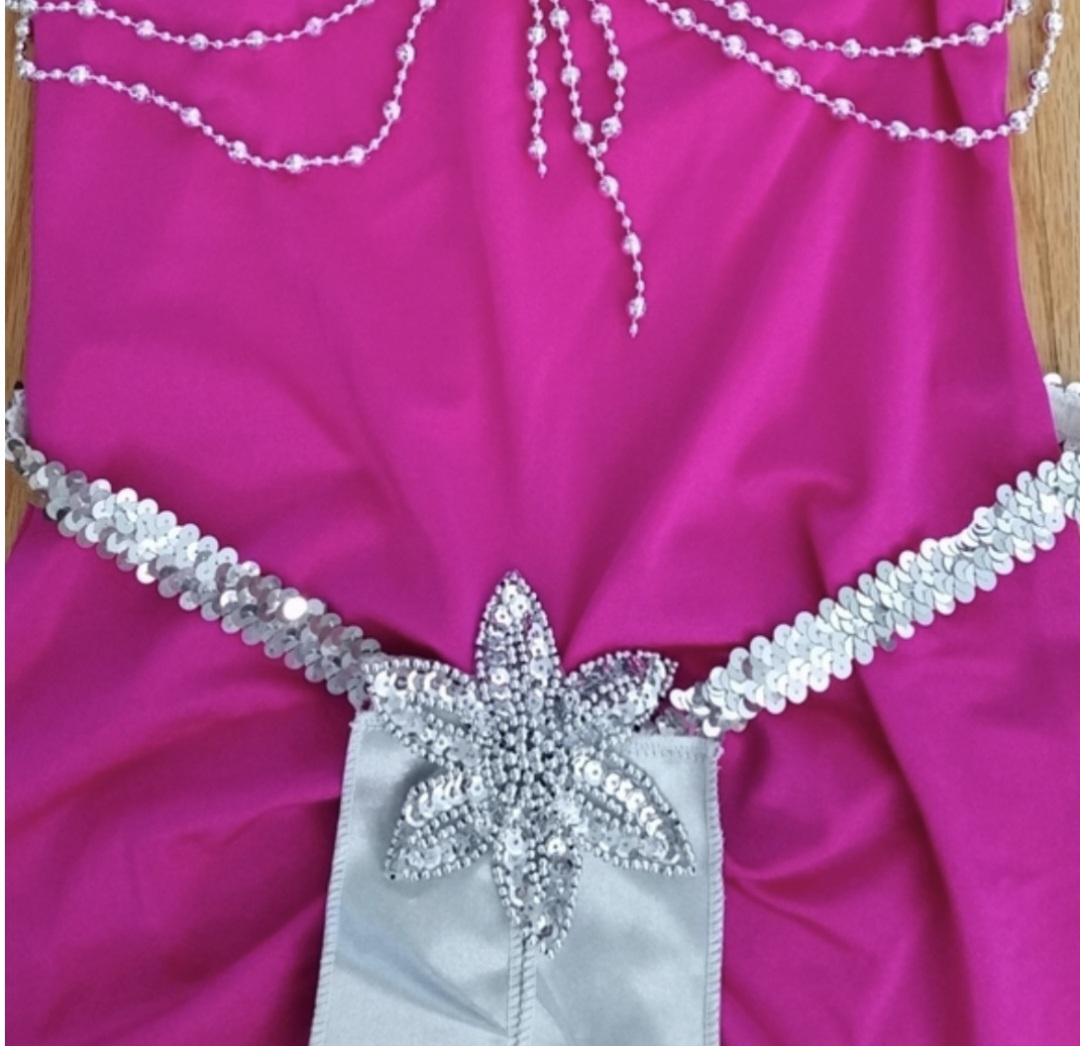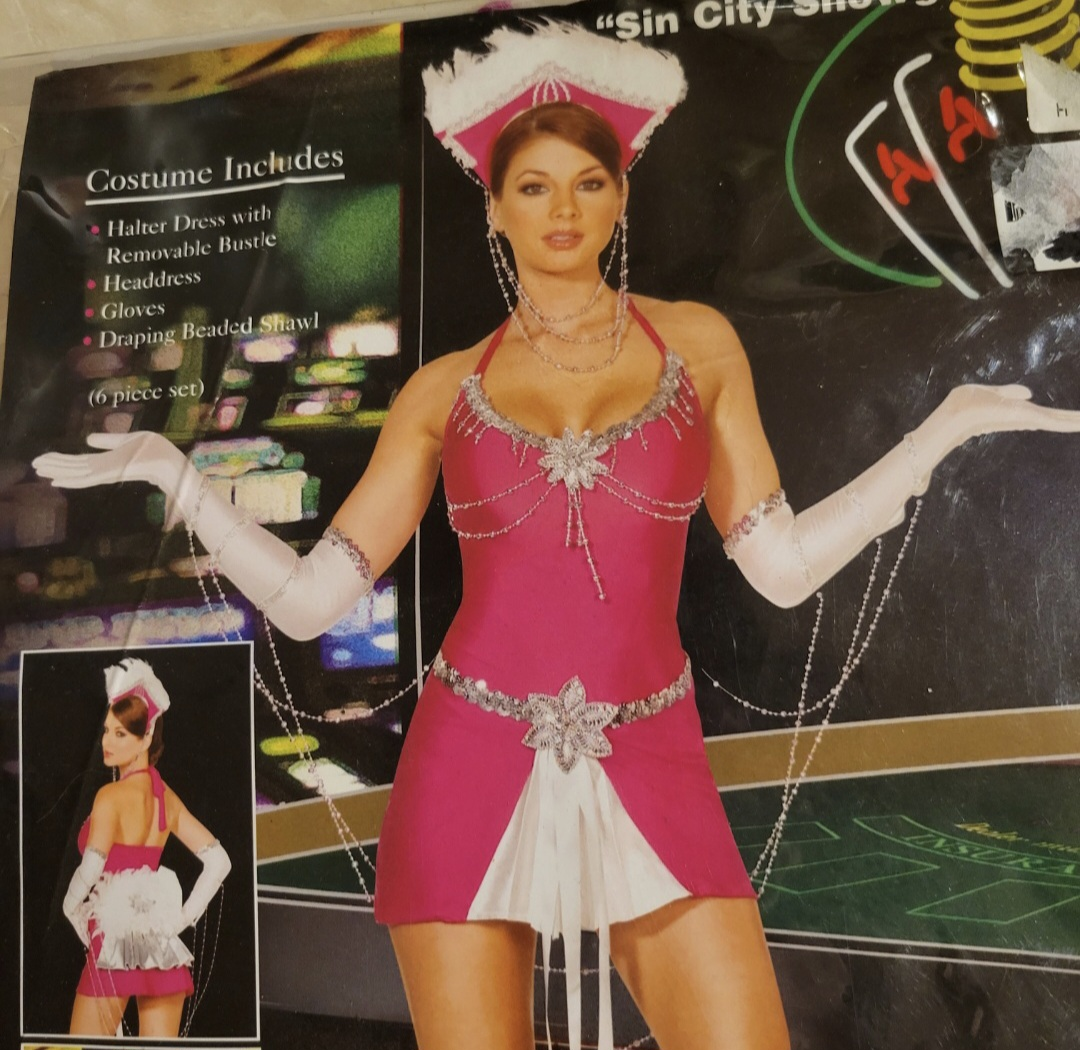 Get ready to shine in this Dreamgirl Sin City Showgirl Costume! This vibrant pink costume includes a halter dress with a removable bustle, a headpiece, gloves. It has everything listed in the package, except the the draping beaded shawl. Size Large, but will fit medium also, perfect for your next costume party or performance.