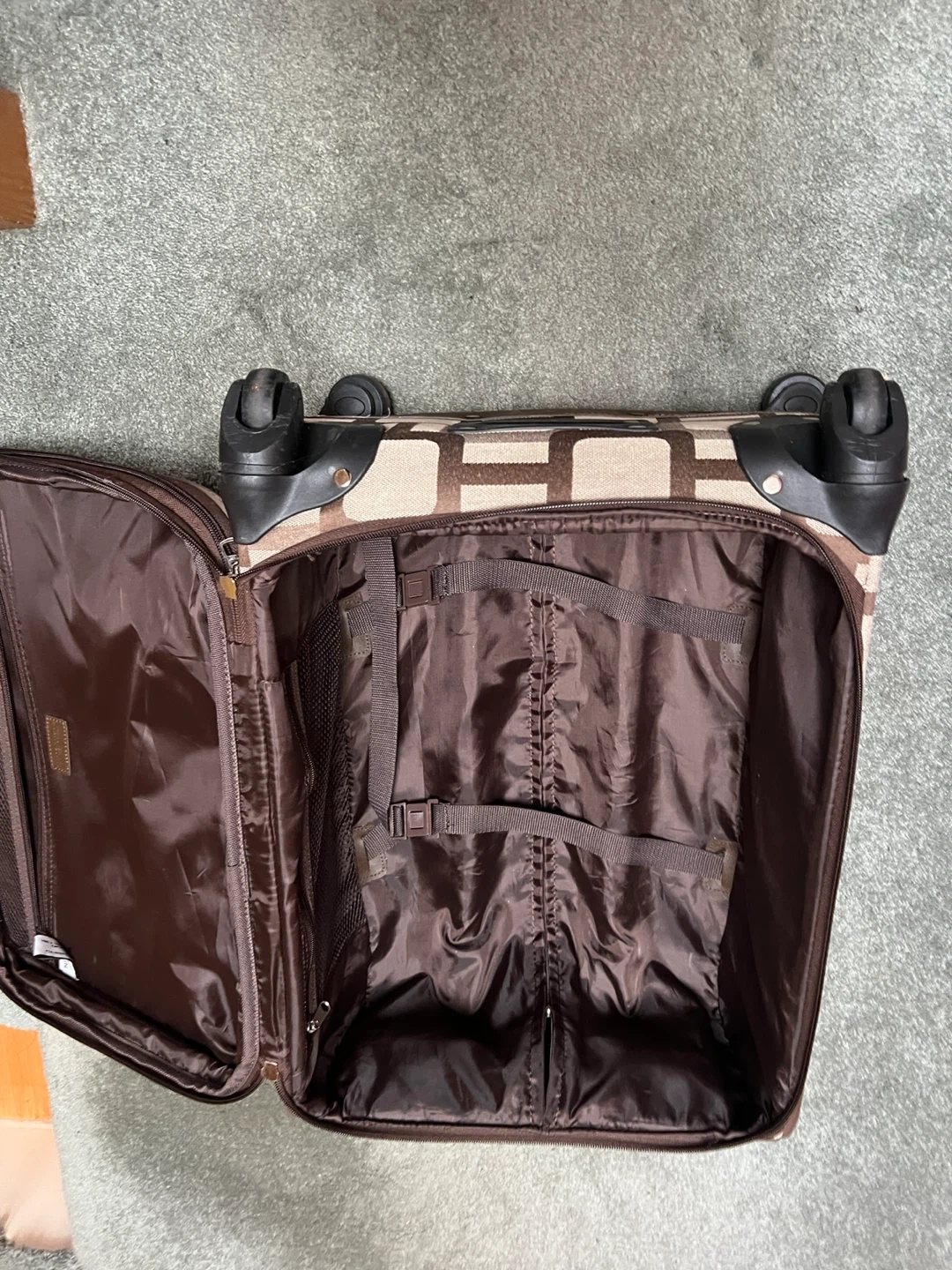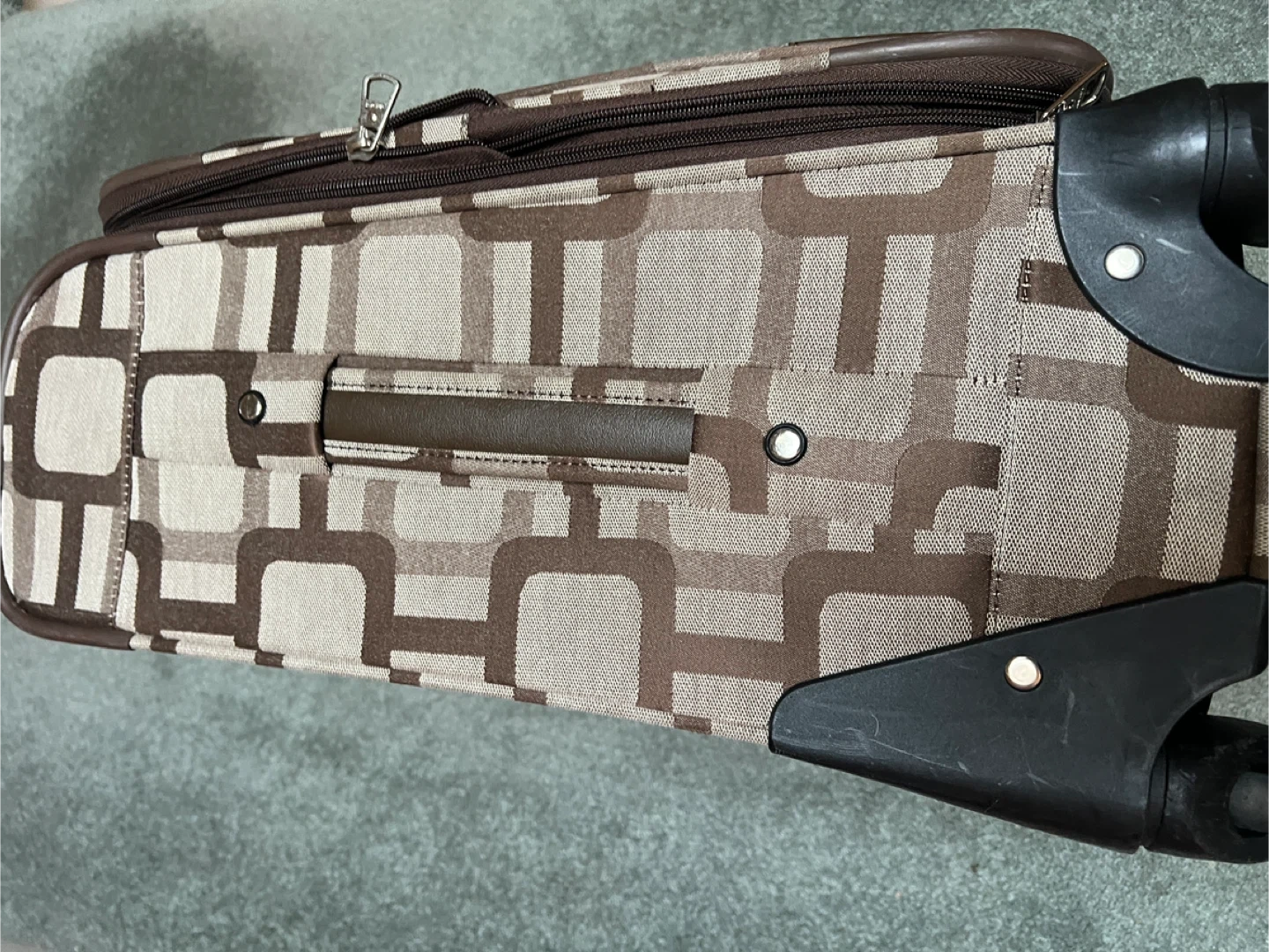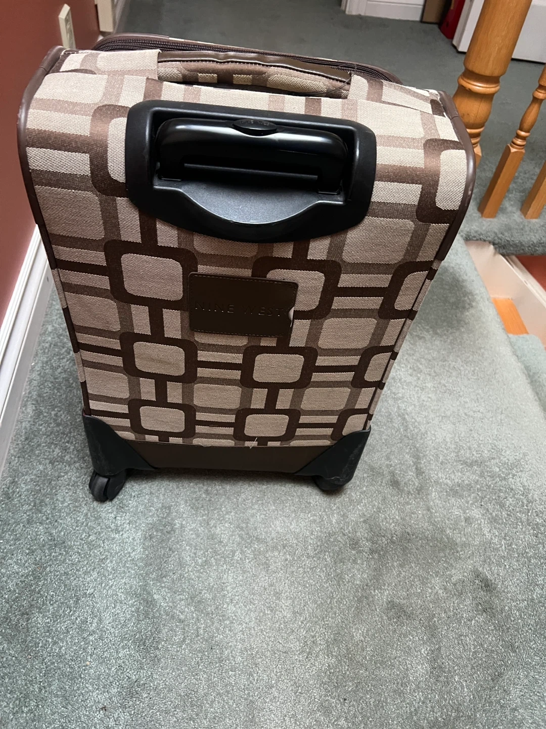 Brown and tan patterned carry-on suitcase by Nine West. It has a retractable handle and spinner wheels. Fabric material. 14 inches across in depth is anywhere from 7 to 9 inches depending on if you choose the expander or not. The suitcase was not used a lot and is an excellent condition. The side handle is something that people don’t realize what a bonus it is to have. Item comes from a pet and smoke free home. Port union/401/Pickering for pick up.