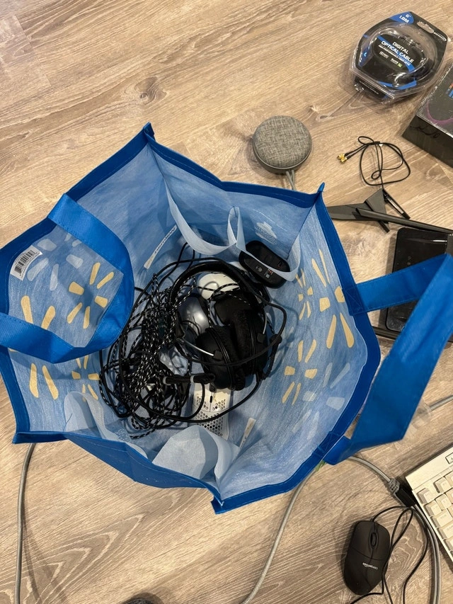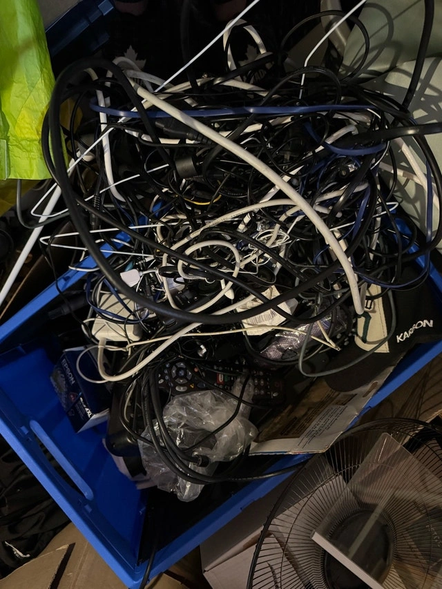 Selling a large lot of computer accessories. Includes a Corsair K70 MK2 keyboard, Razer Blackshark V2 headset, Razer Naga Epic mouse, D-Link router, and an Asus adapter, plus everything else shown in the photos. Also includes a bin of random cables, remotes, old phones, and more. Take it all for $100. Owner selling.