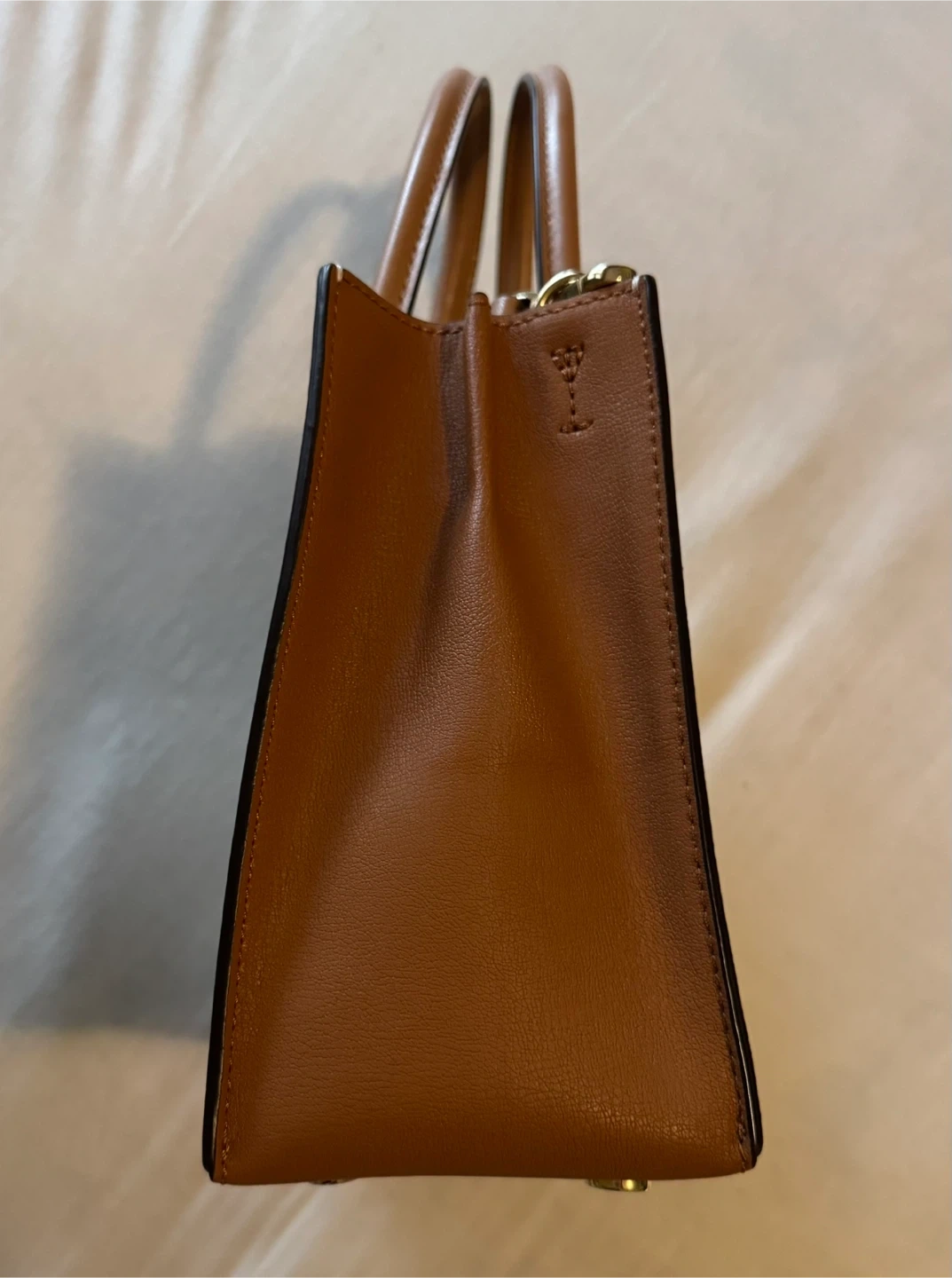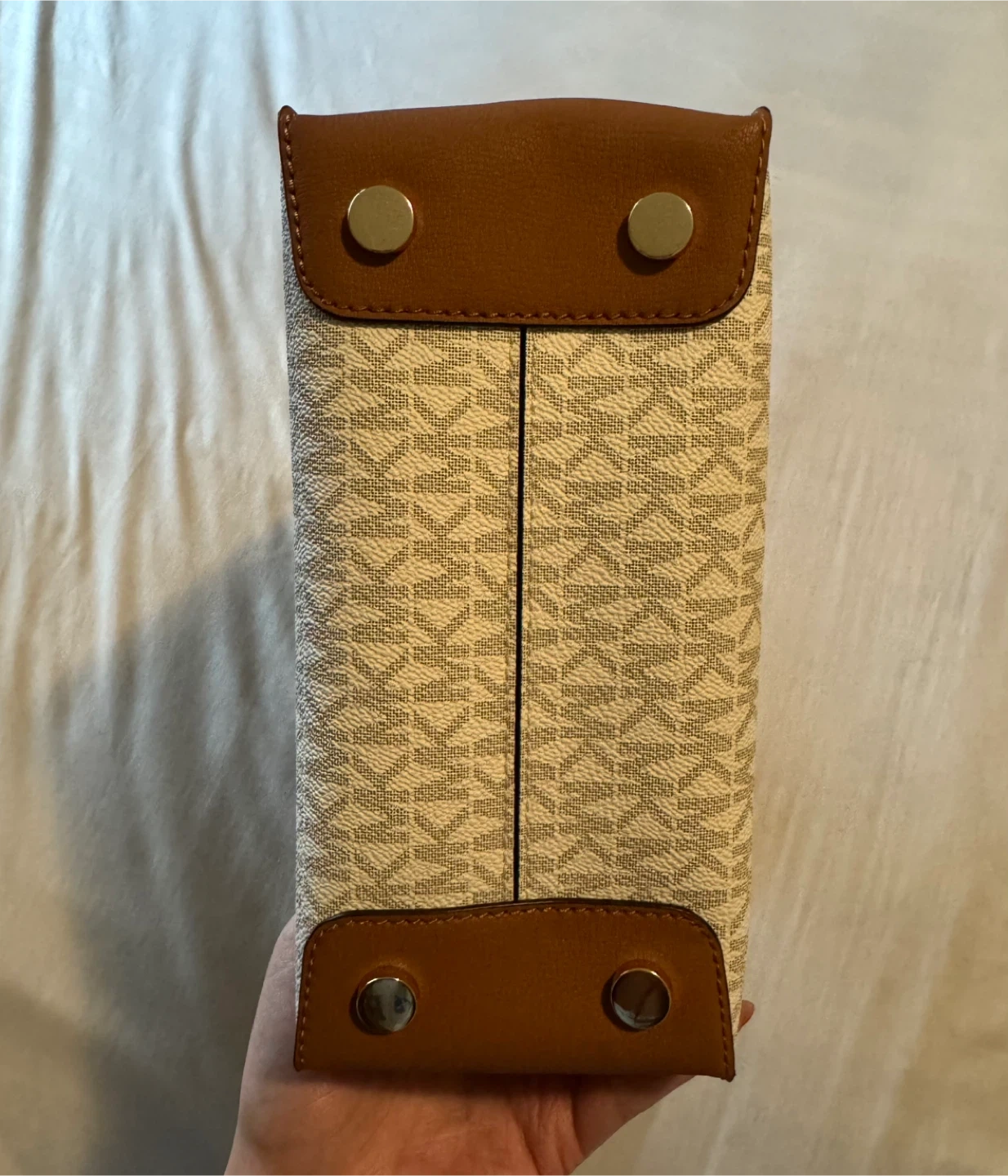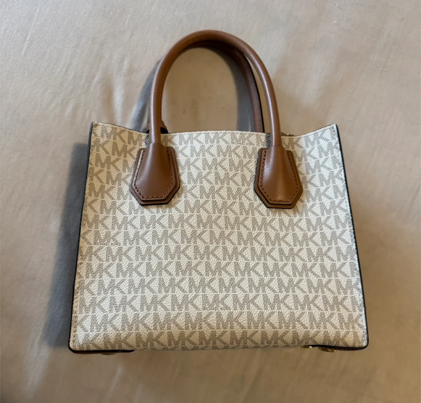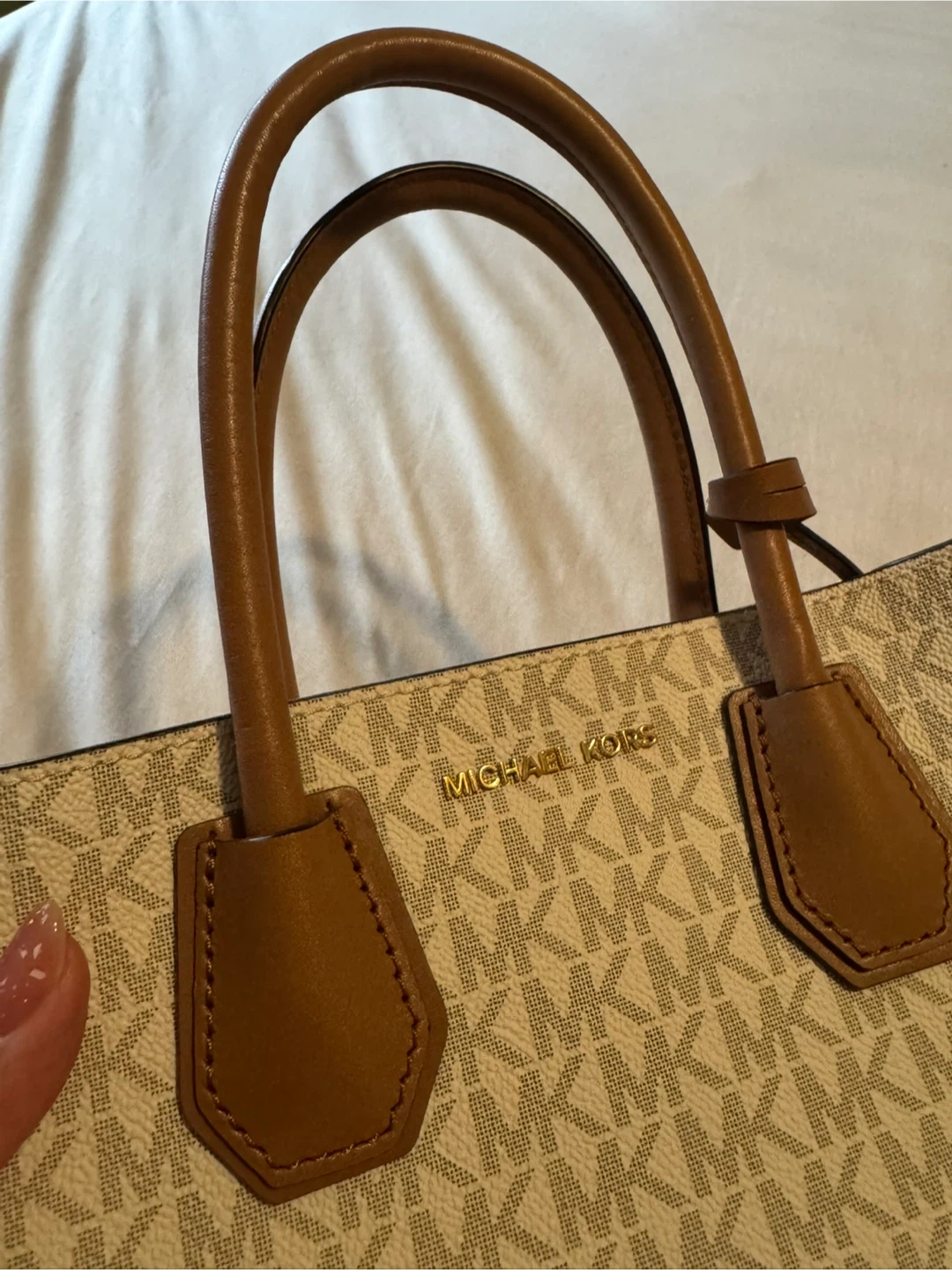 Michael Kors satchel handbag with signature logo print and tan leather trim. Comes with a dust bag and adjustable shoulder strap. Interior zip pocket and card slots included.