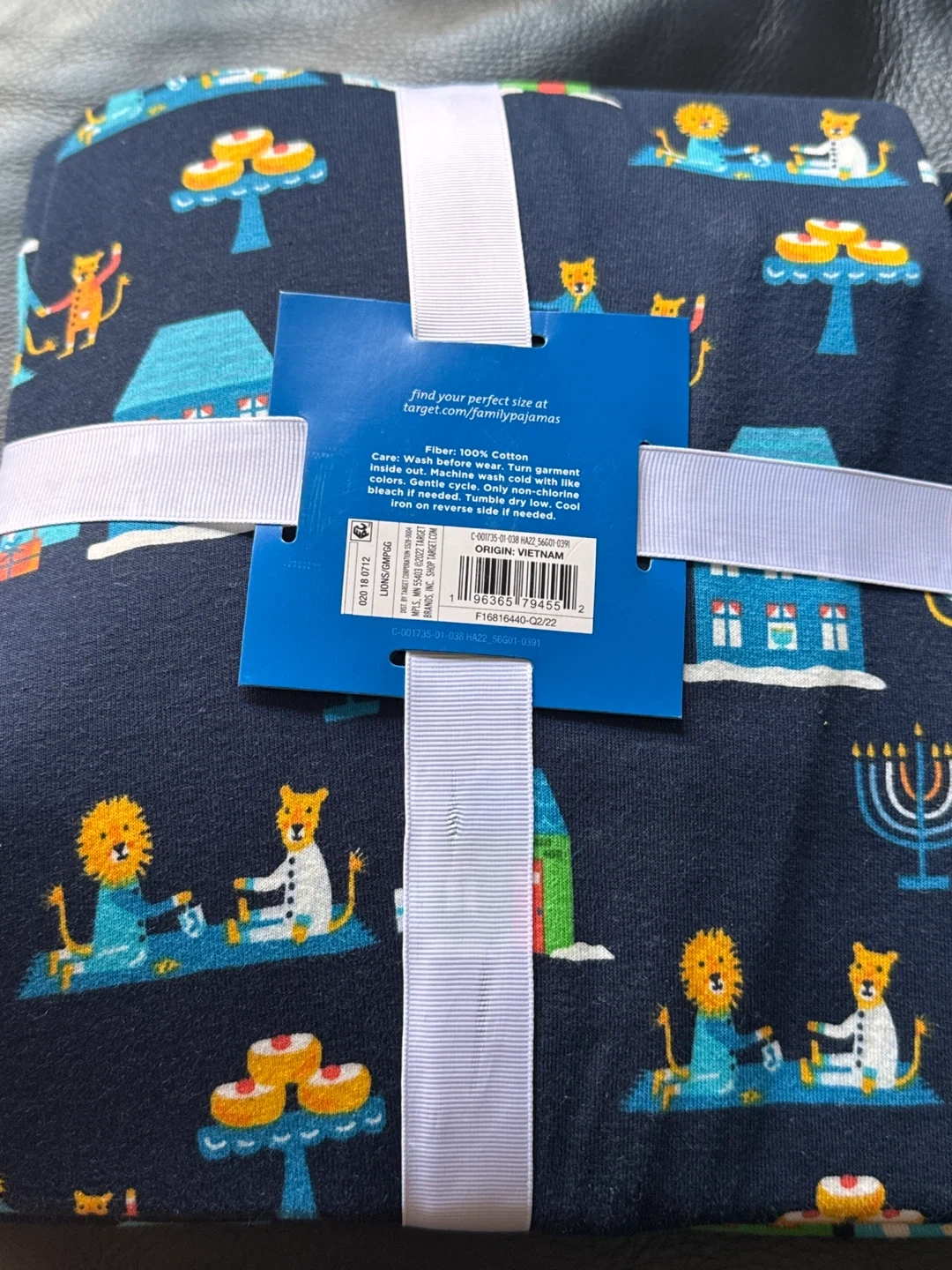 These women's family sleep pajamas are a 2-piece set. They're made of 100% cotton for comfort. The set features a festive navy blue pattern with Hanukkah-themed designs.