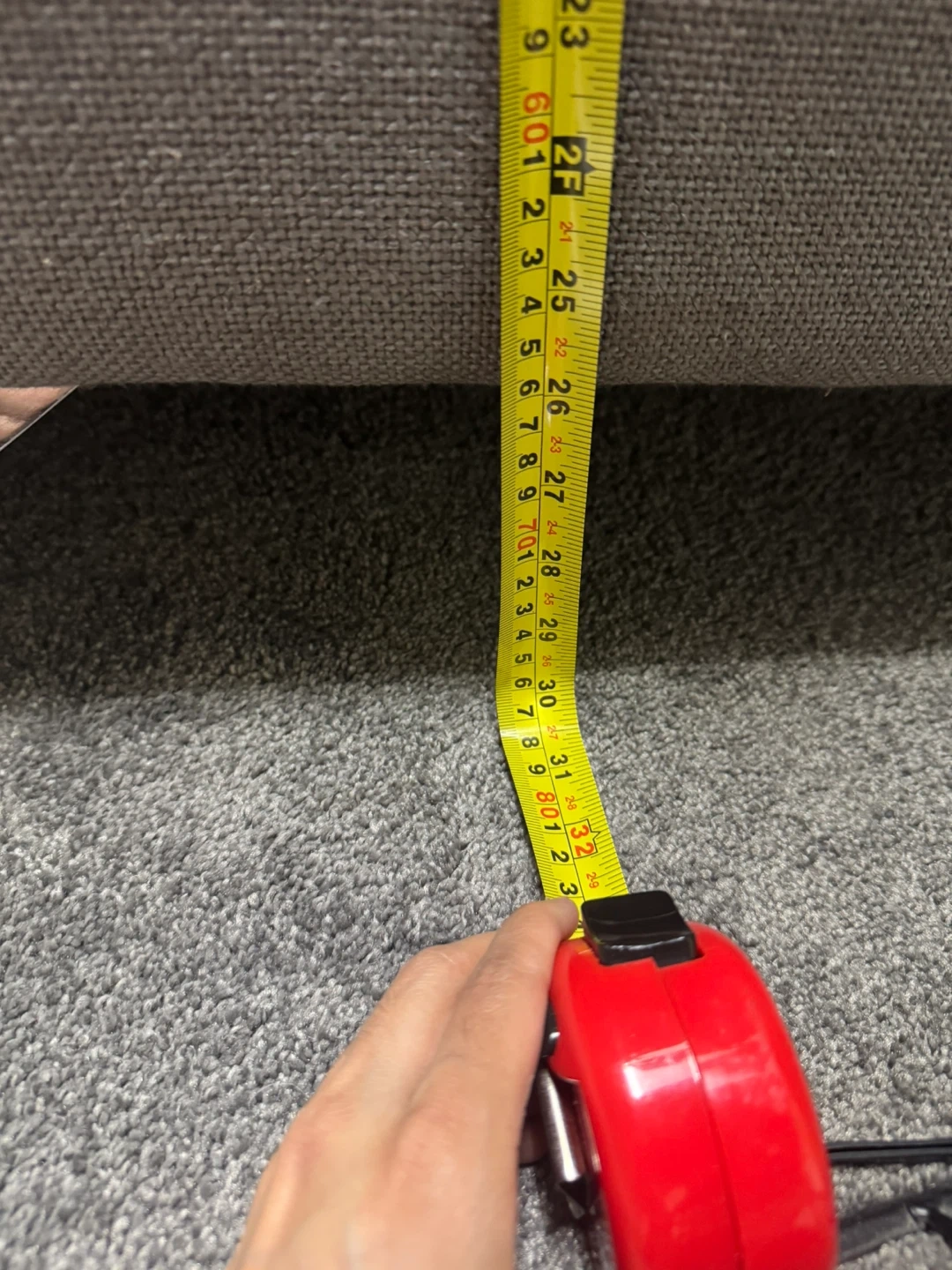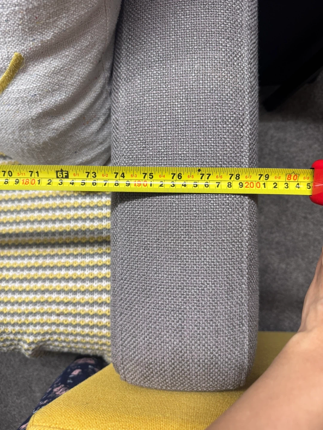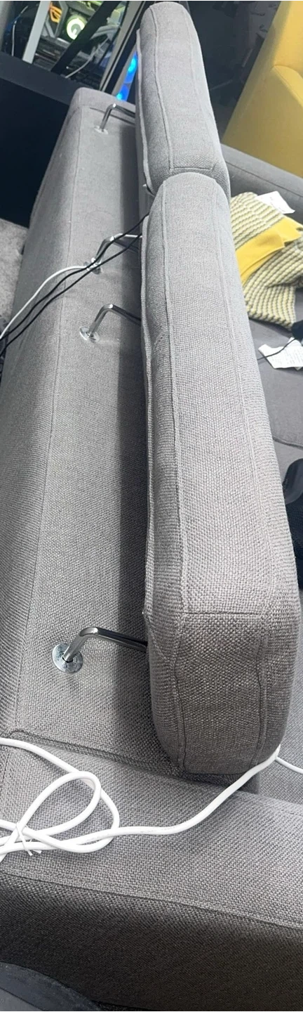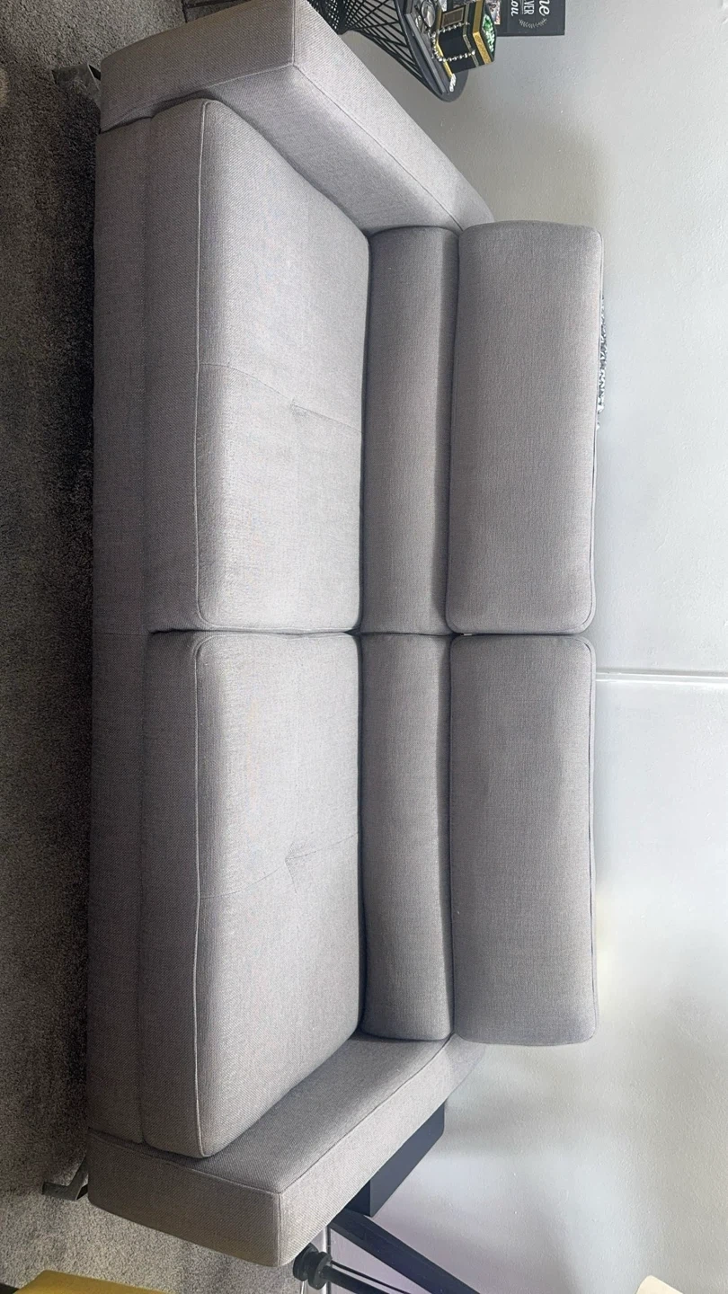 There is a small tear in the fabric between the cushions (shown in last picture). It does not affect the comfort or structure of the sofa, price reflects the condition. It's not even visible as shown in last picture.