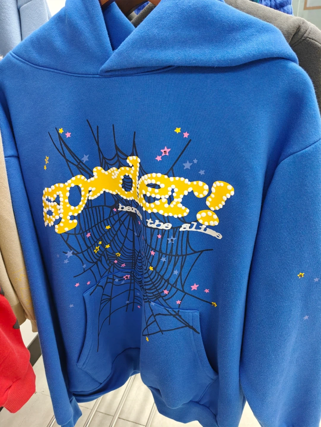 Selling a Brand new blue Sp5der hoodie. It has a unique design with a spiderweb and star details on the front and back
