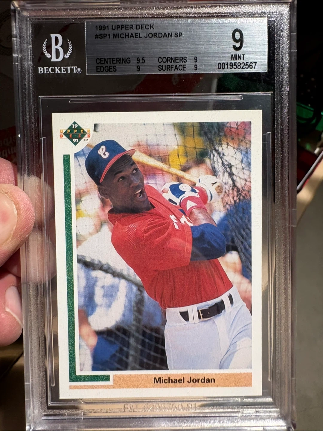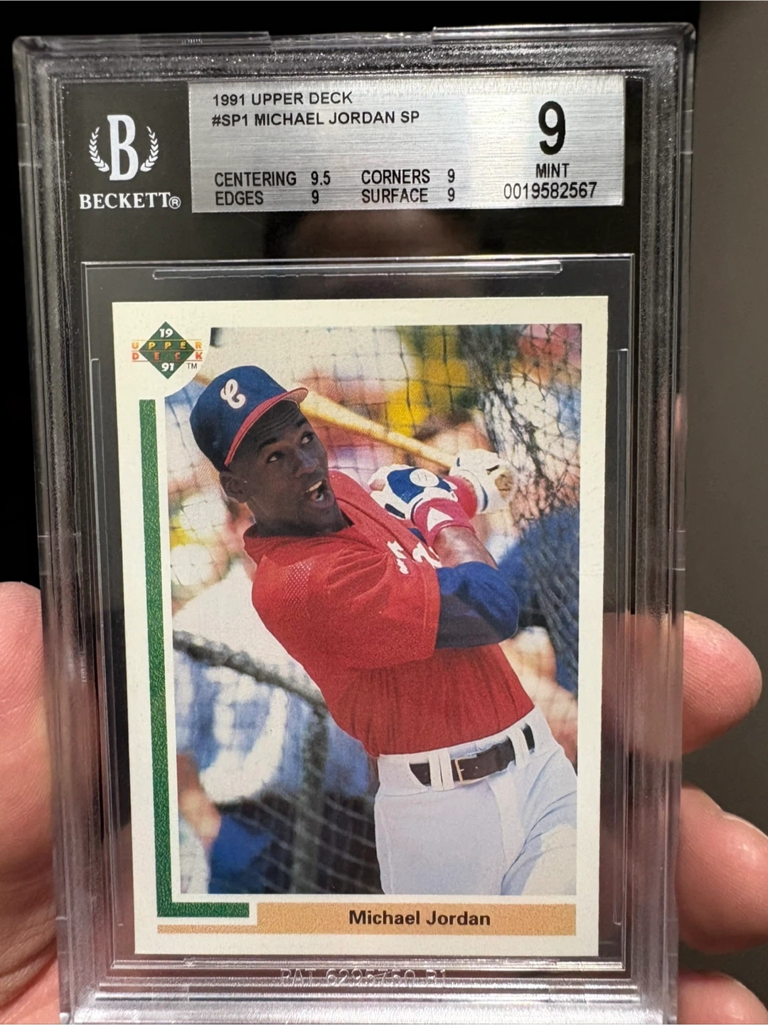 This is a 1991 Upper Deck Michael Jordan SP baseball card, professionally graded by Beckett at a Mint 9! It's a sought-after collectible for any baseball or basketball fan.
