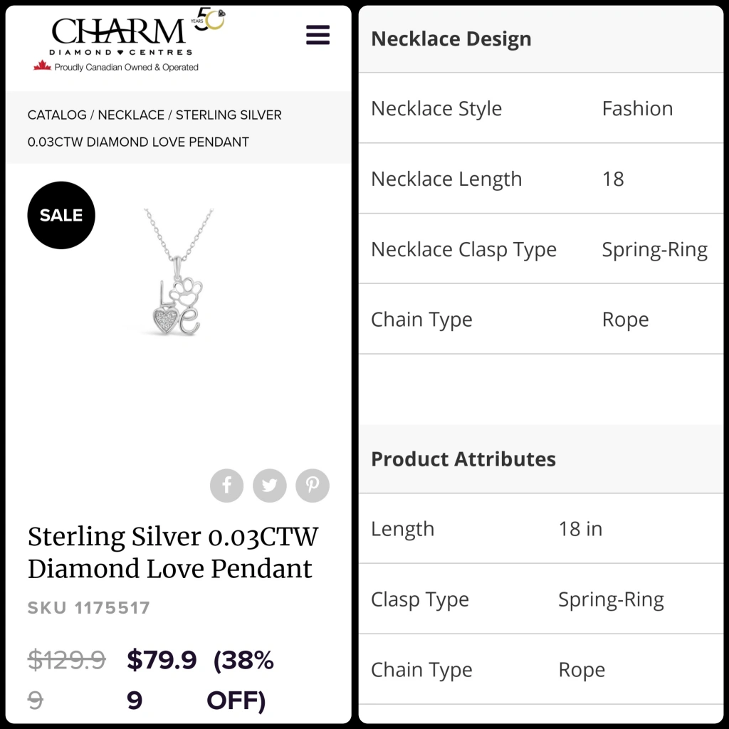 Orignally retails for $129.99 on the Charm Diamond Centers website. When I looked at the website they were offering a 38% discount at $79.99. So after taxes, it's a $90 necklace. (See photo 8.)