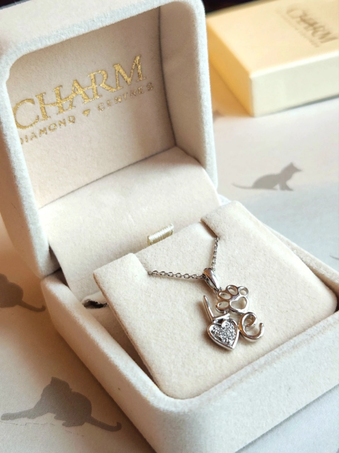 It's still in its original packaging. The velvet lined necklace box and the outer cardboard box. (Both with the Charm Diamond Centers logo)