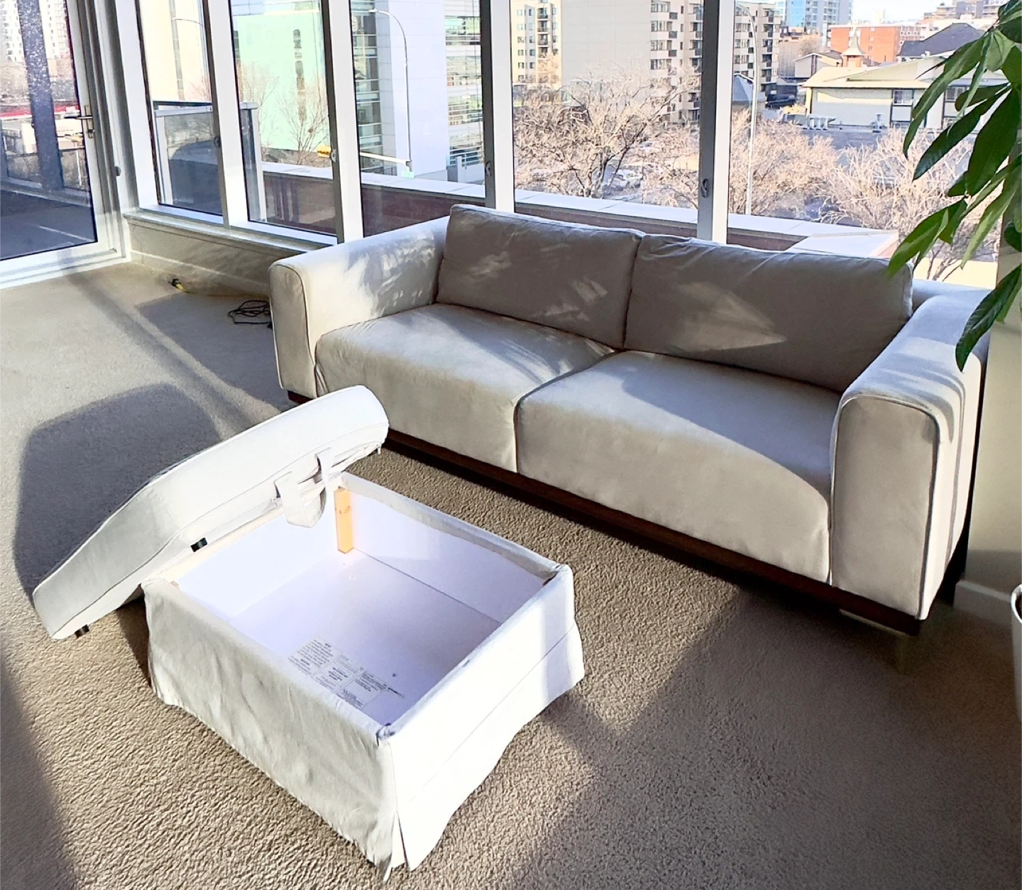 Looking for a cozy addition to your living space? This comfortable beige sofa is perfect for relaxing and comes with a matching ottoman featuring built-in storage.
