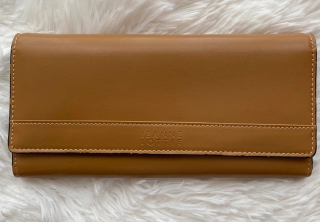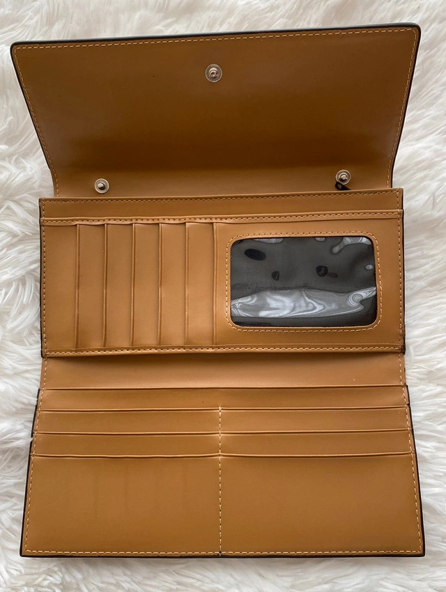 Wallet with 12 slot compartments and 2 zippered compartments.