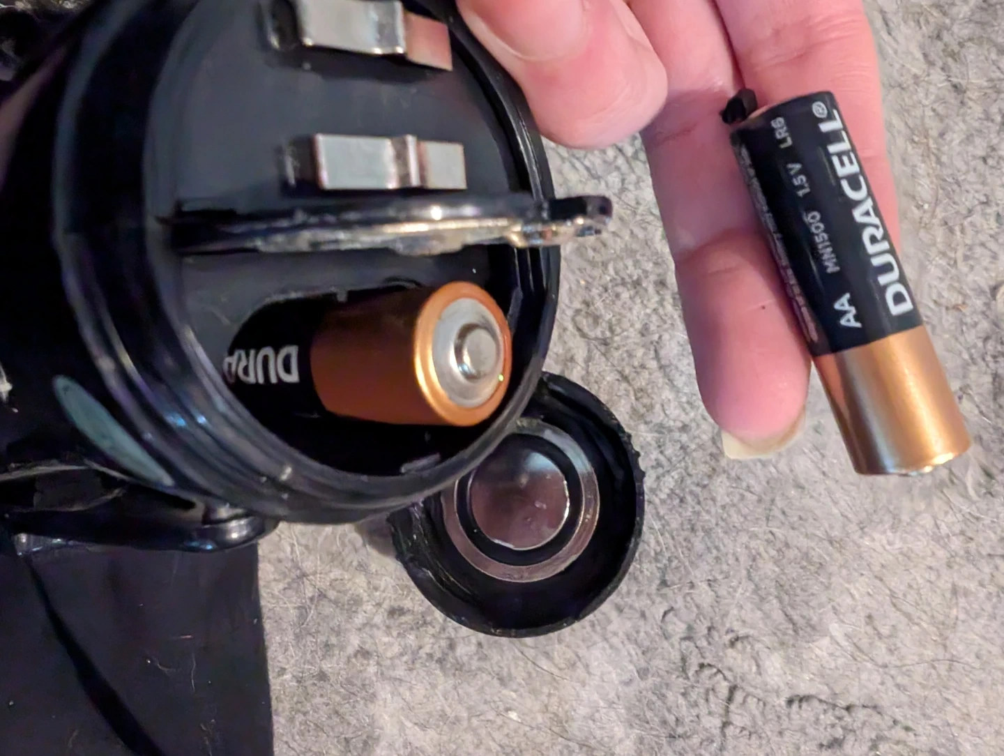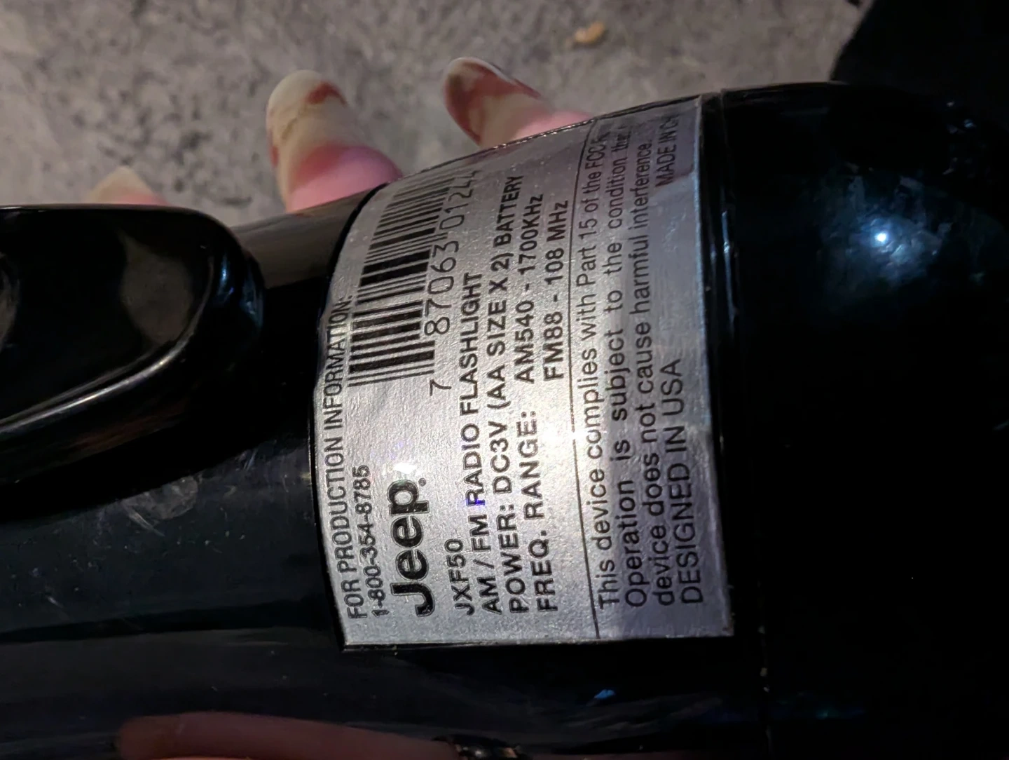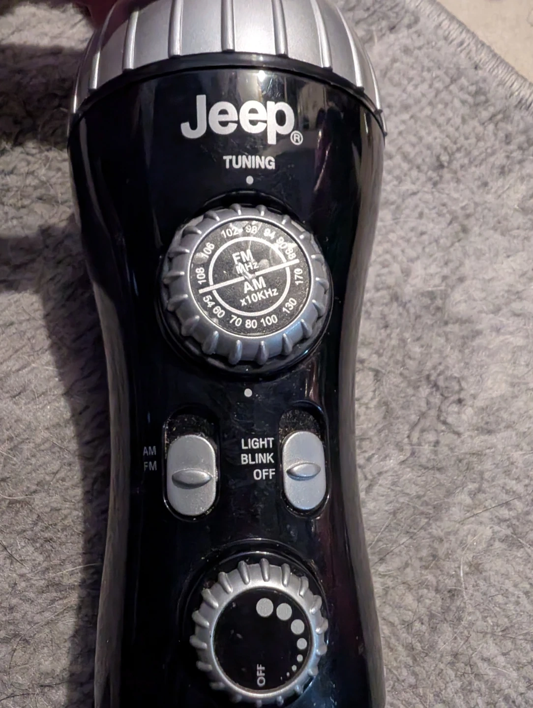 This is a black Jeep brand portable AM/FM radio flashlight, but I'm not sure the light still works. The frequency range is FM 88-108 MHz and AM 540-1700 KHz. It has an adjustable clip. Takes two AA batteries. The plastic that holds down the battery cover broke off as shown, but I'm sure it would be fine to just tape it down.