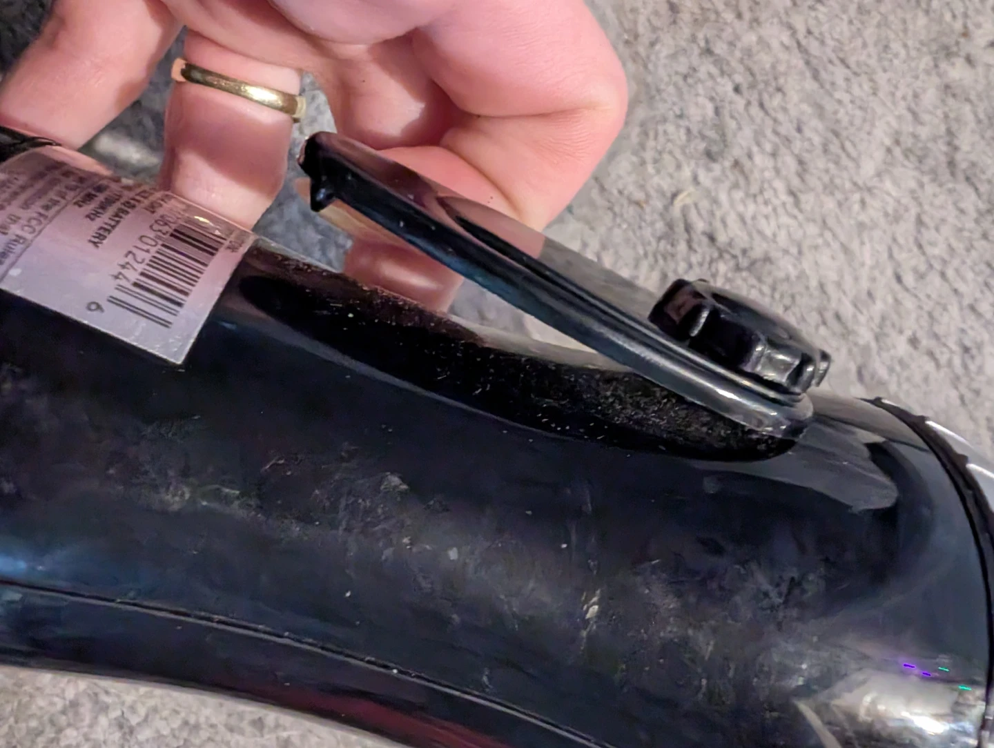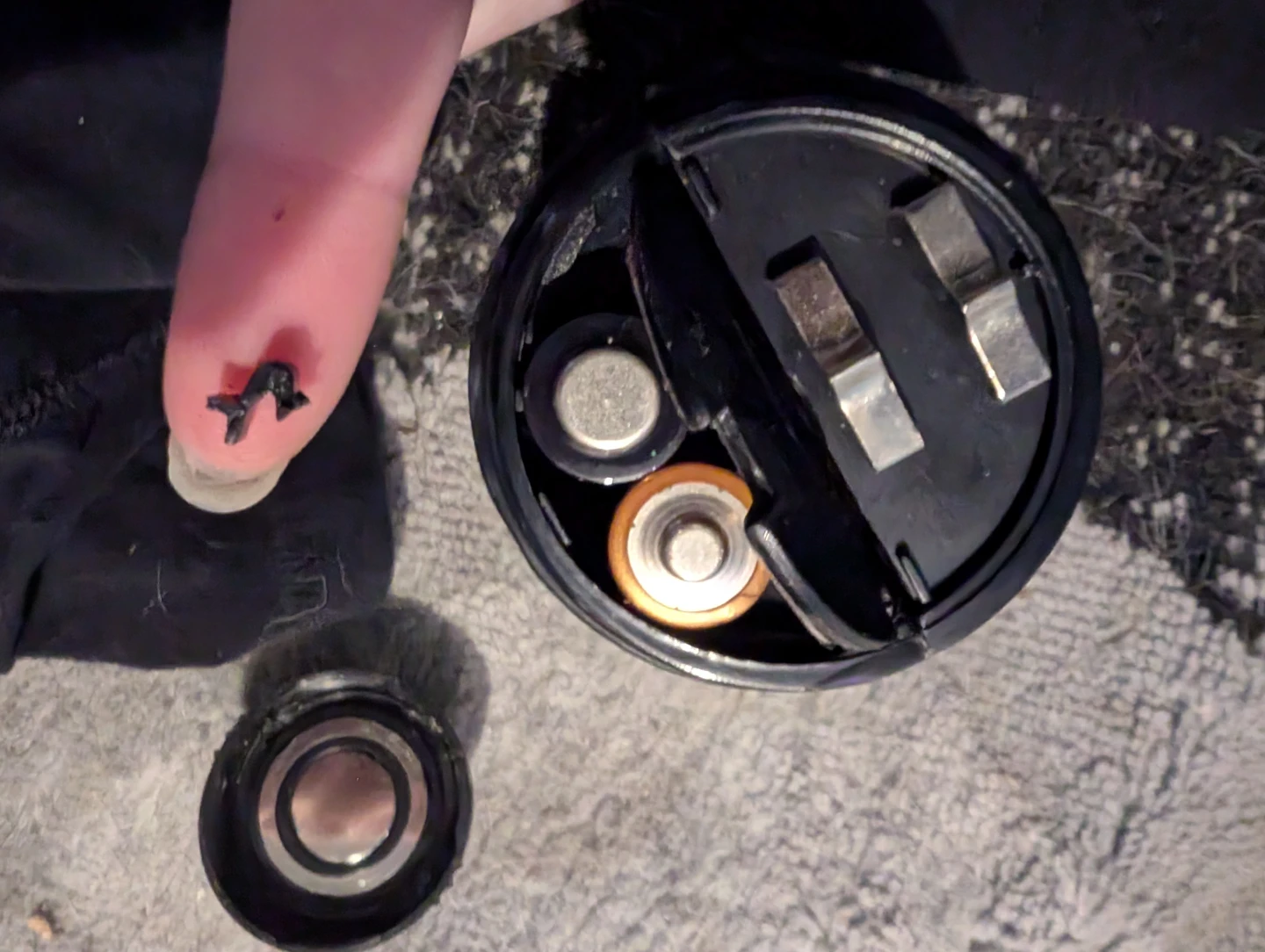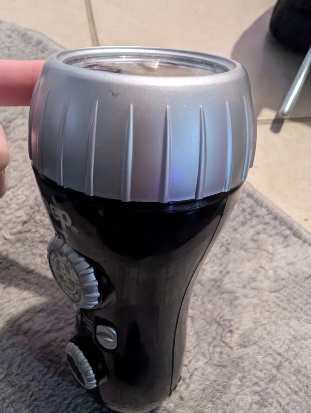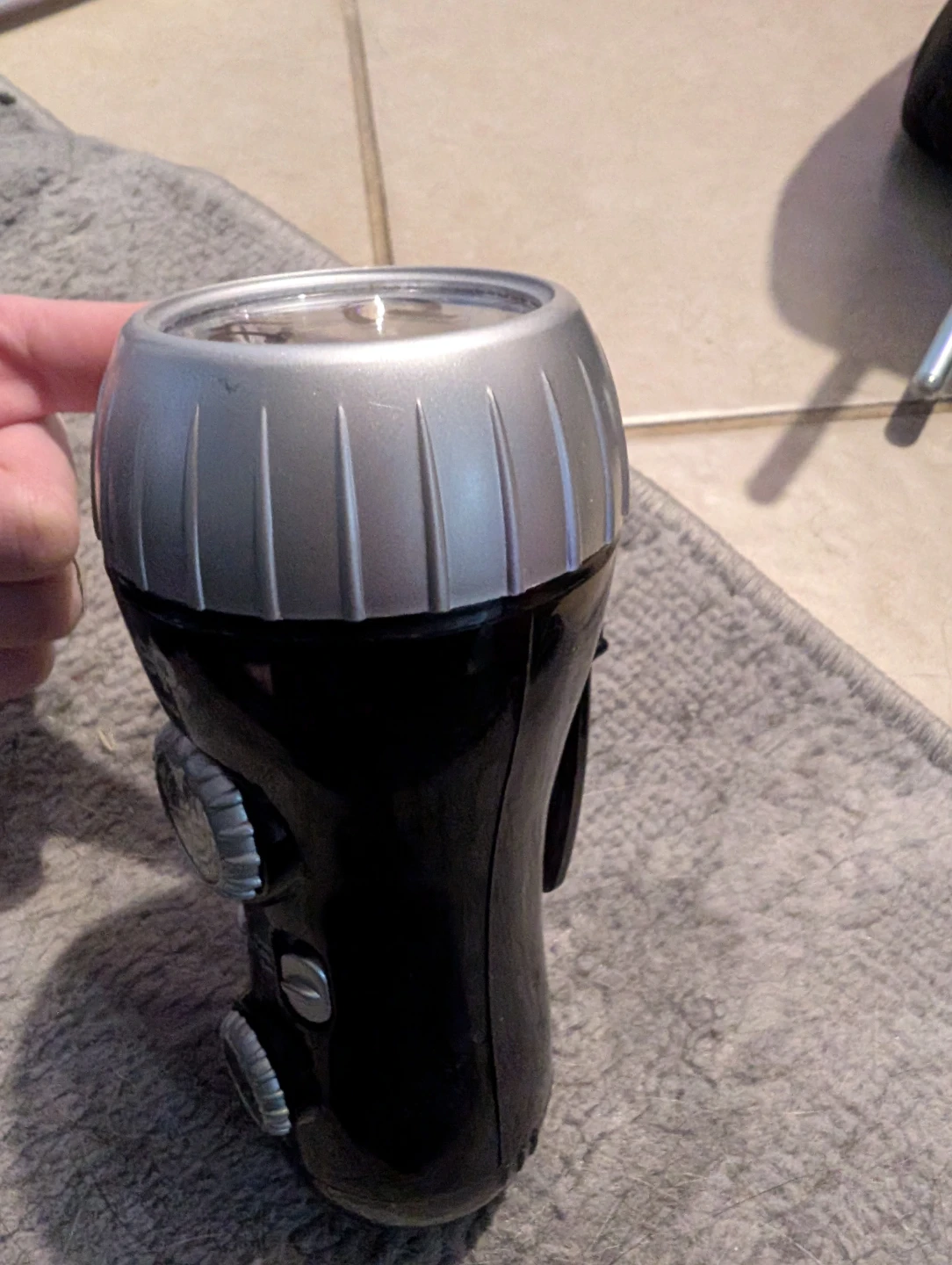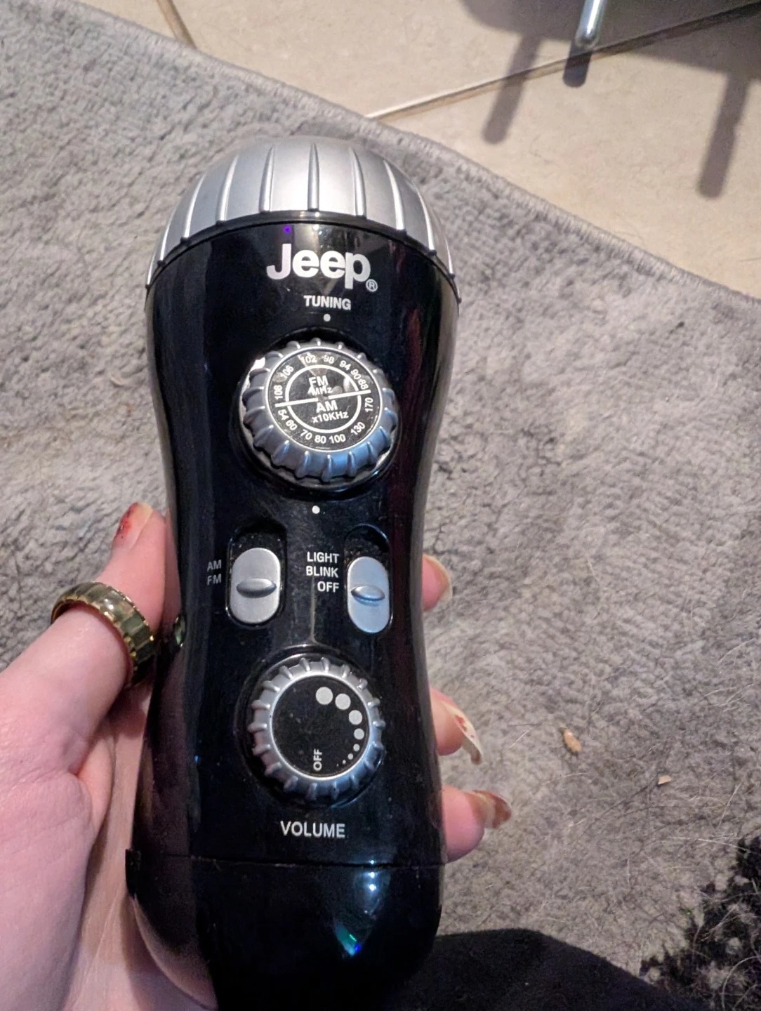 This is a black Jeep brand portable AM/FM radio flashlight, but I'm not sure the light still works. The frequency range is FM 88-108 MHz and AM 540-1700 KHz. It has an adjustable clip. Takes two AA batteries. The plastic that holds down the battery cover broke off as shown, but I'm sure it would be fine to just tape it down.