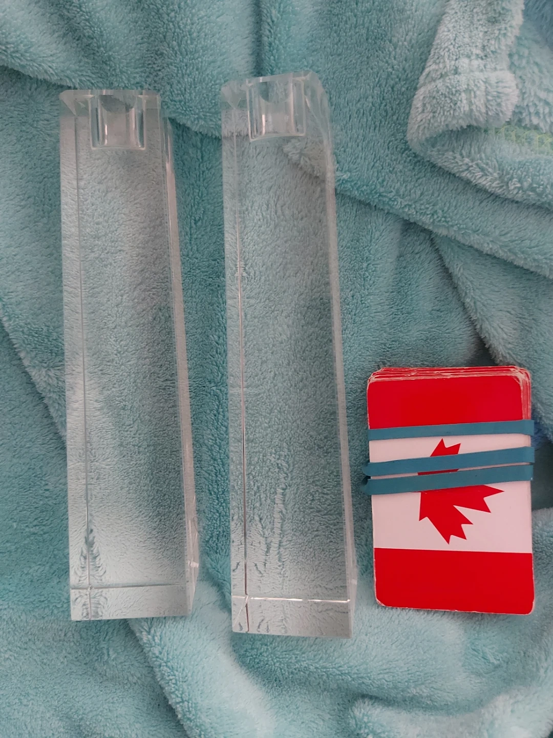 Two clear glass candlestick holders. Perfect for adding a touch of elegance to any table setting. These holders are made of heavy glass and are designed to hold taper candles securely. They're a great addition to your home decor! One has a small crack on the top in the photo. Cards for size.